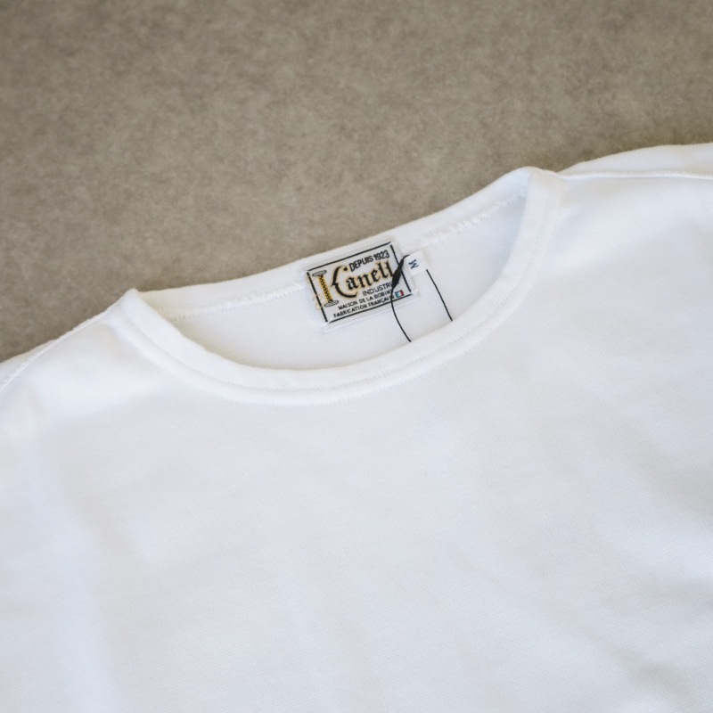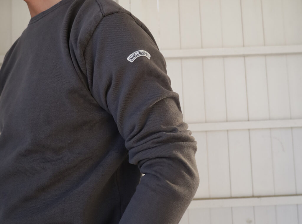 使用している素材はVintage Jersey。極限まで度目を詰めたヘビーウェイトな編地は重厚でありながら、横編み機独特の柔らかさを兼ね備えています。一般的なバスクシャツ の生地とは全く別で伸縮性があり、ガッシリとした生地ながらもはじめから着心地が柔らかく着やすいです。