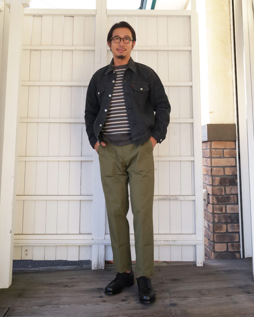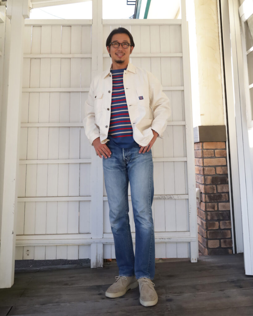 色落ちジーパンに、Workersのホワイトのカバオールなんて洒落ておりますね。