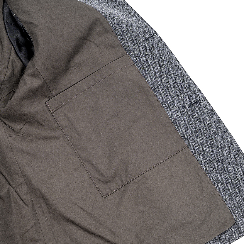 バッファローチェックのメルトンはWorkresオリジナル。14.7ozの極厚生地。10 番のウール糸を2本撚り合わせ5番相当に。それを織機にかけられる限界の密度で織りあげ、さらに縮絨(洗って縮め)して起毛させています。ブラックグレーの落ち着いたトーンのチェックの為、スタイリングがしやすいのも嬉しいところ。