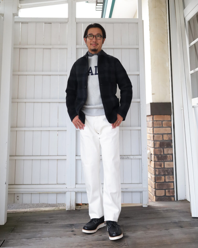 Championのスウェットに801ホワイト、足元は別注トリッカーズでモノトーンなアメカジに。