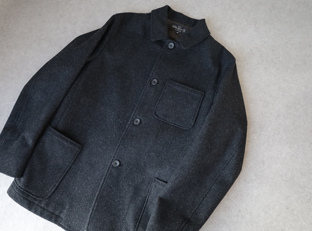 バッファローチェックのメルトンはWorkresオリジナル。14.7ozの極厚生地。10 番のウール糸を2本撚り合わせ5番相当に。それを織機にかけられる限界の密度で織りあげ、さらに縮絨(洗って縮め)して起毛させています。ブラックグレーの落ち着いたトーンのチェックの為、スタイリングがしやすいのも嬉しいところ。