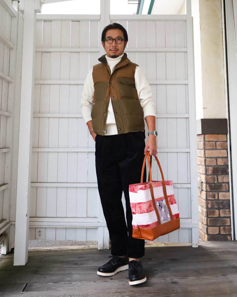 コーディロイになることで黒の角がとれ柔らかい印象になりますのでFilsonnベストにWorkersのRAF sweaterなんて色と素材感ギャップを使ったスタイリングも問題なし。
