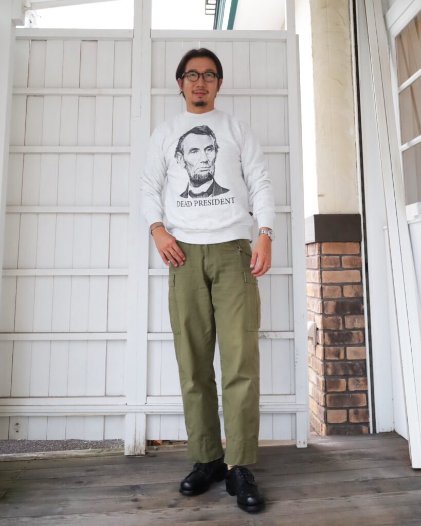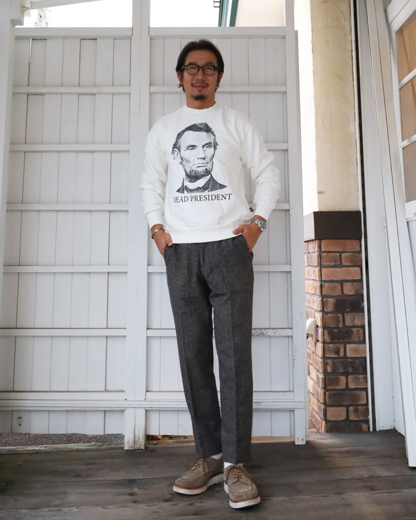発色の良いスウェットなので、土臭いアイテムとの相性が良いです。