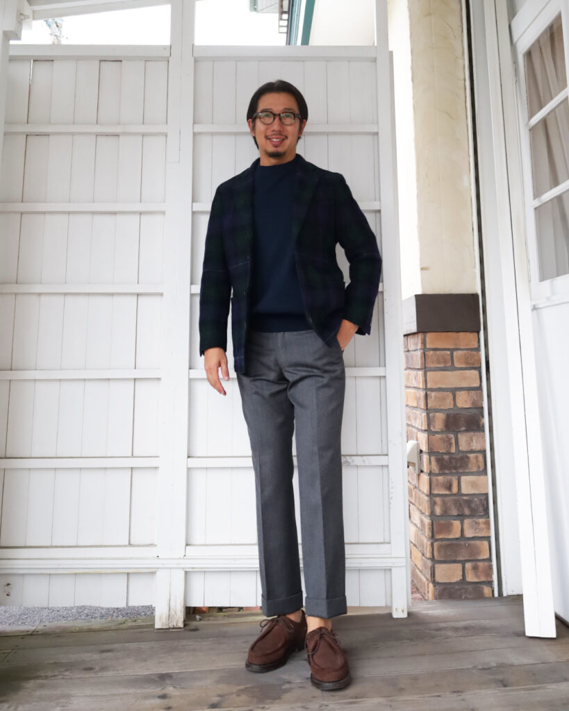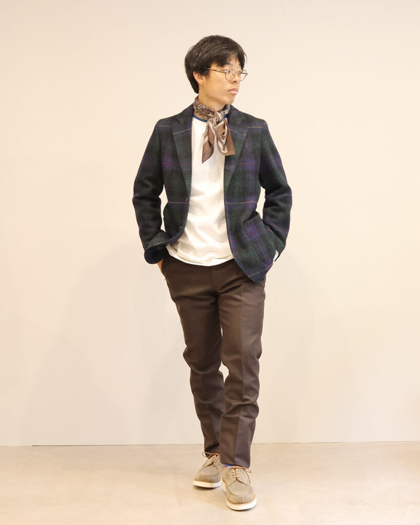 シマフジはKANELLにスカーフ、Barnstormerのフラノトラウザー Brownで。別注トリッカーズで遊び心を持ってスタイリングしても良いですね。