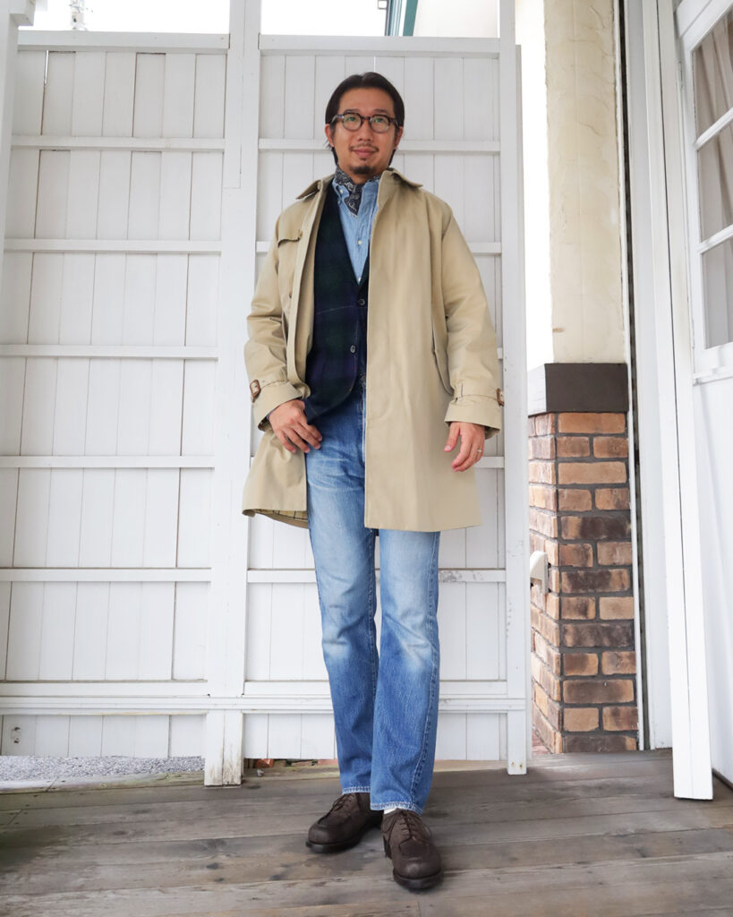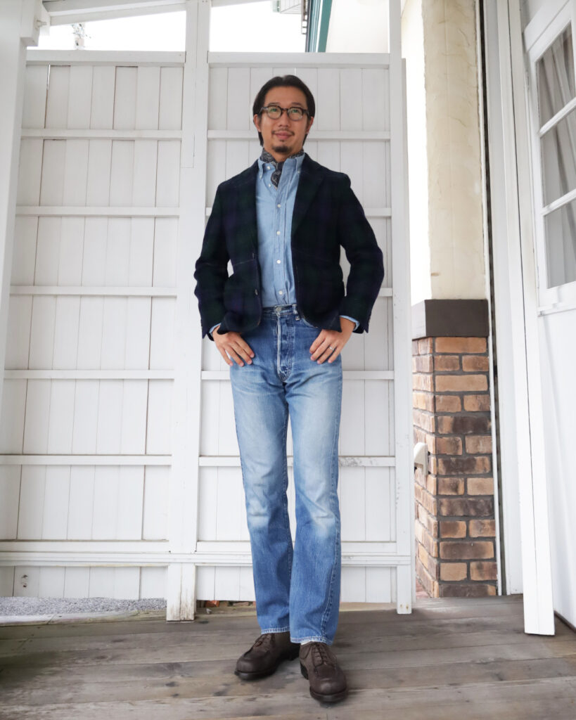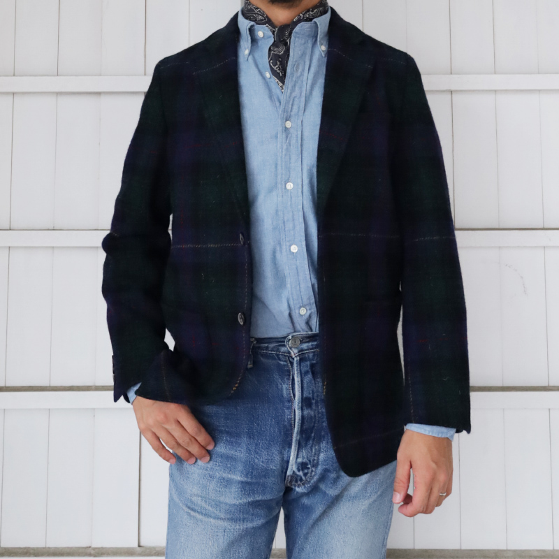 イギリスとアメリカが交わったジャケットということで、ジーパンにシャンブレーのアメリカの香り漂うアイテムと合わせるのが良いかと。