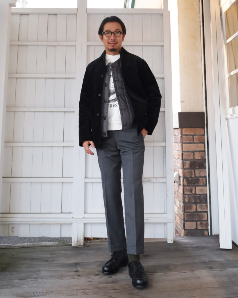 Sloppyのスウェットに、キャバレリーツイルのトラウザー、足元はGB001のモノトーンなスタイルにいかがでしょう。