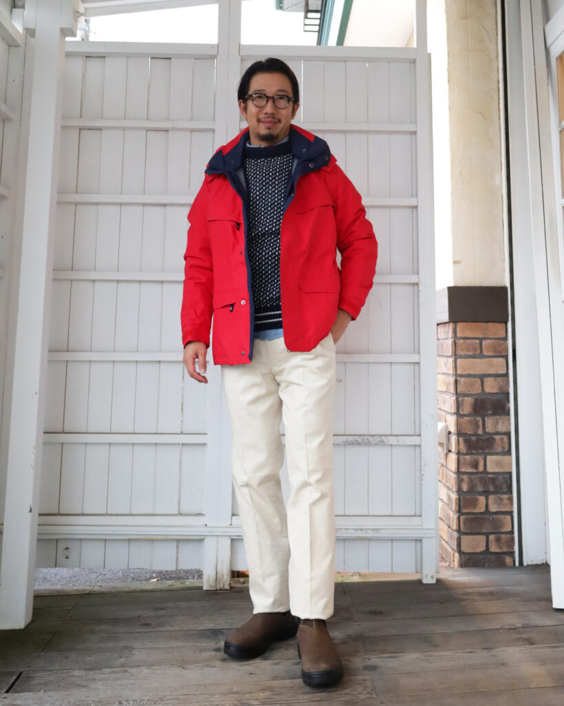 インナーのバーズアイのセーターでビーンなアメリカな雰囲気を注入。