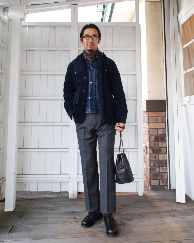 アウターはWorekrsのカシミヤ混のサファリJKTで合わせました。