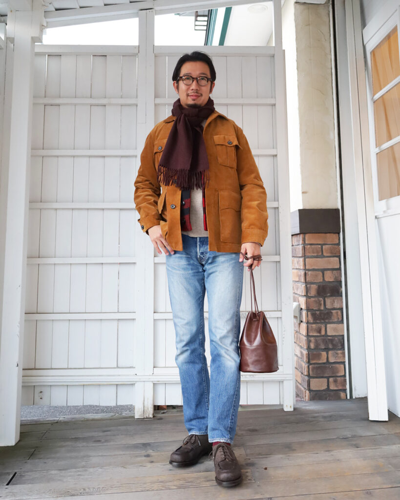 インナーはコムアーチのセーターにFILSONのベストをレイヤードしております。