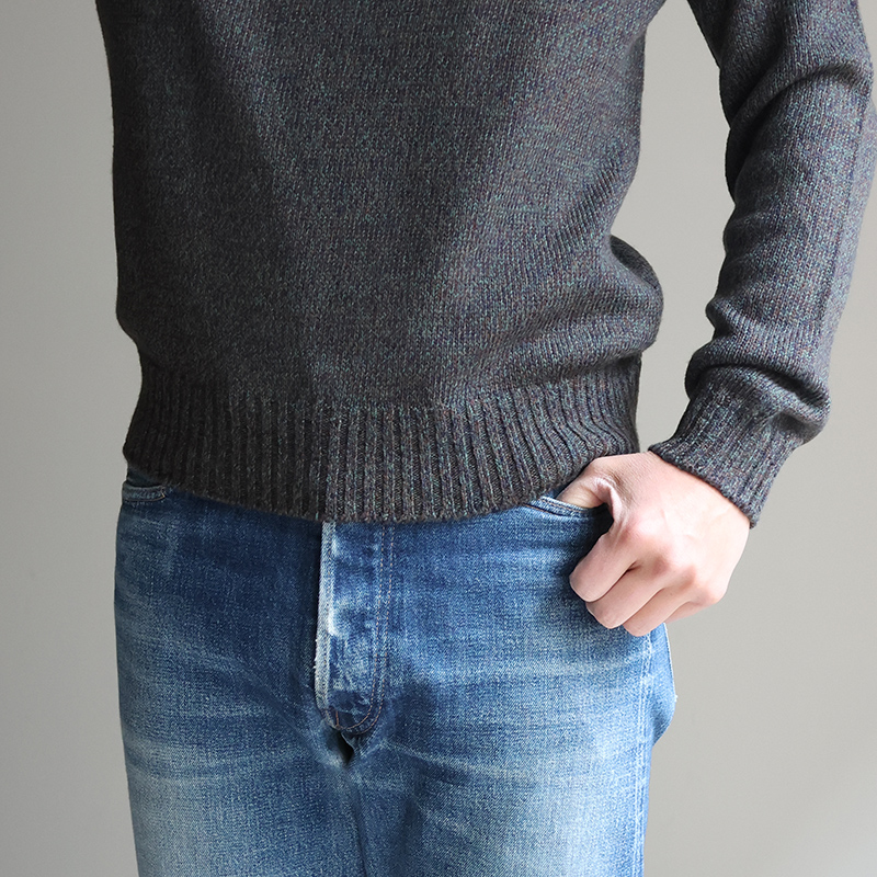 通常の状態でも滑らかなメリノウールにさらに独自の加工を施しより極上の質感、さらにピーリングも起きにくくなるという強度も求められるセーターにぴったりな素材でございます。