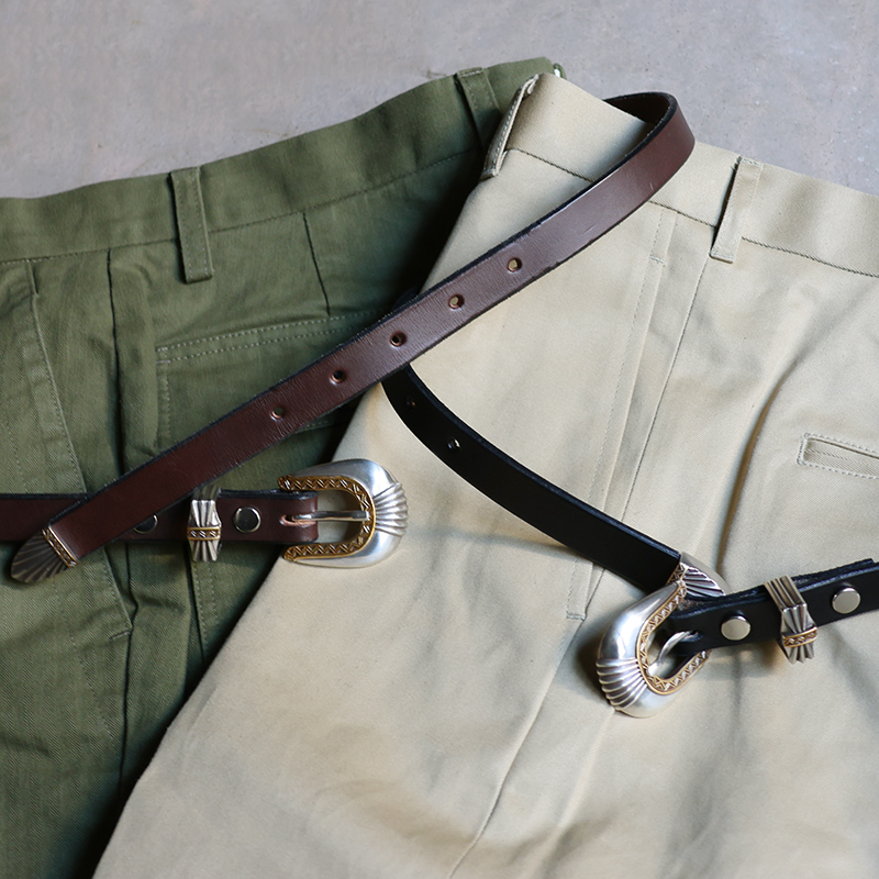 普段はあまりベルトをせずジャストサイズでボトムス選びをすることの多い当店ですが、こちらはスタイリングへの程よいアクセントという用途で抜群の味付けをしてくれるので珍しくオーナーもお気に入り。