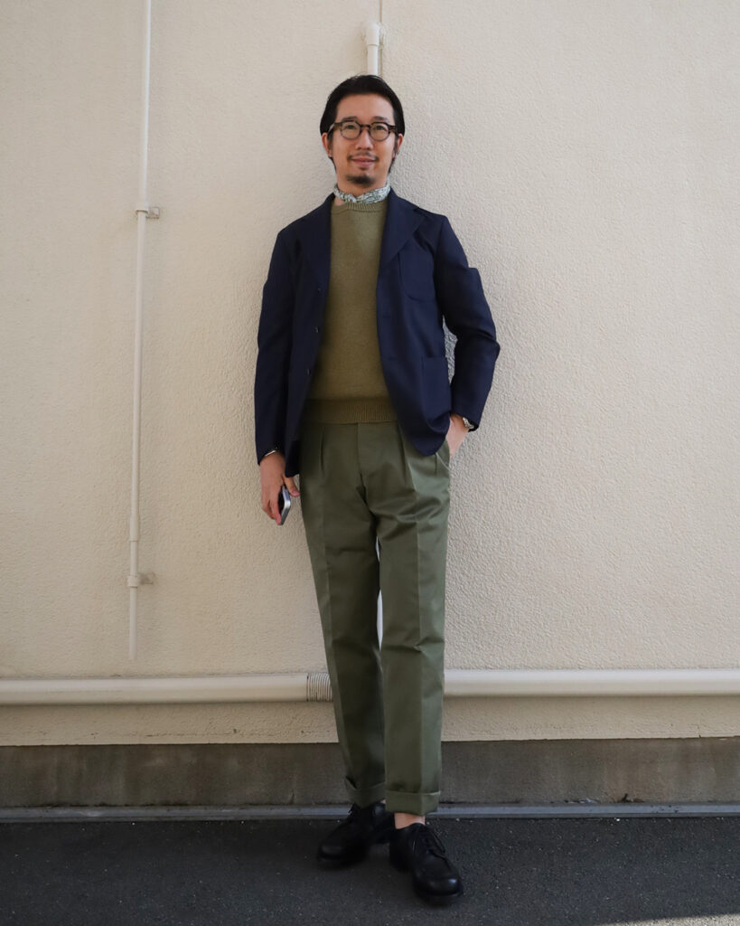 大事な着こなしですがコムアーチのリネンニットにリングジャケット1954のチノトラウザーにいかがでしょうか。