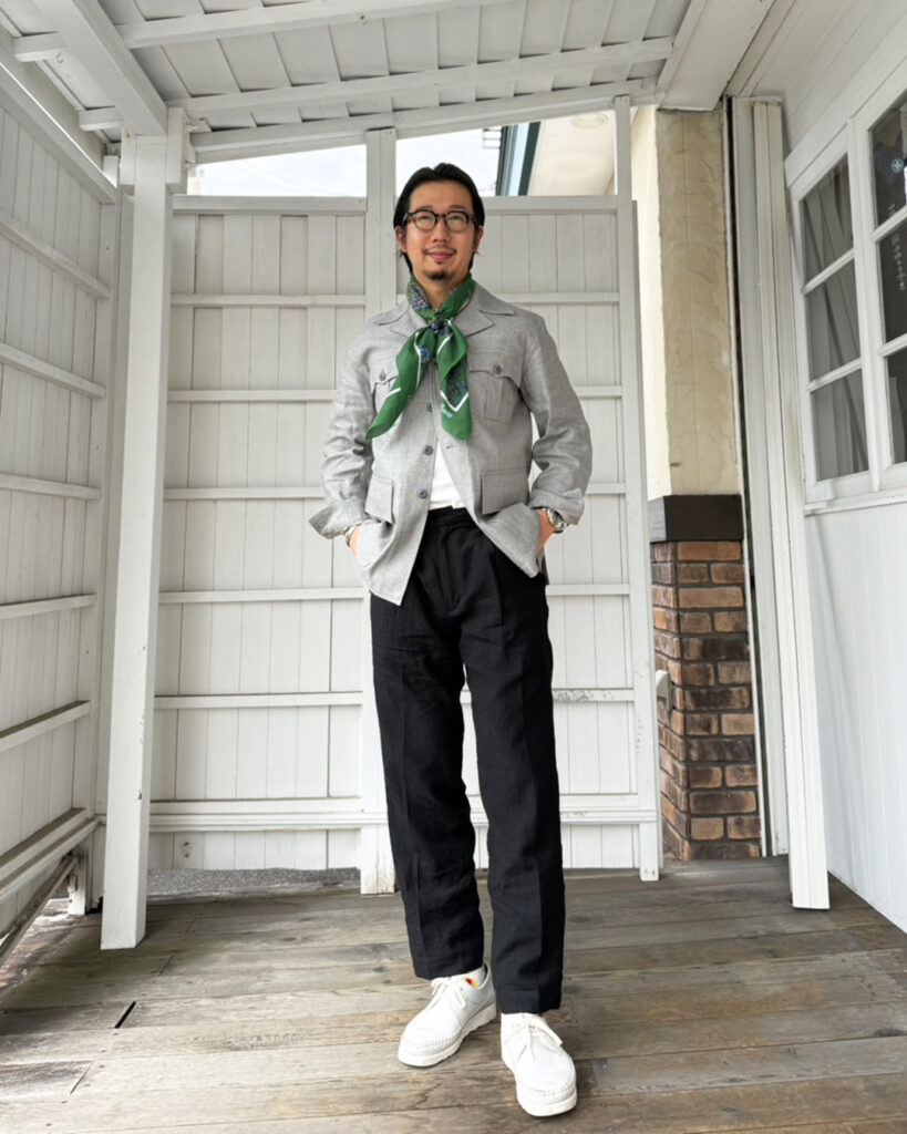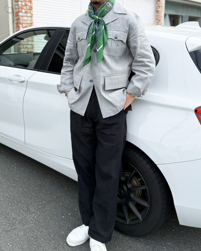 もう少し暖かくなれば、コムアーチのリネンシャンブレーのイージートラウザーに首元はD.C.WHITEのスカーフでおフランスの空気を添えて。