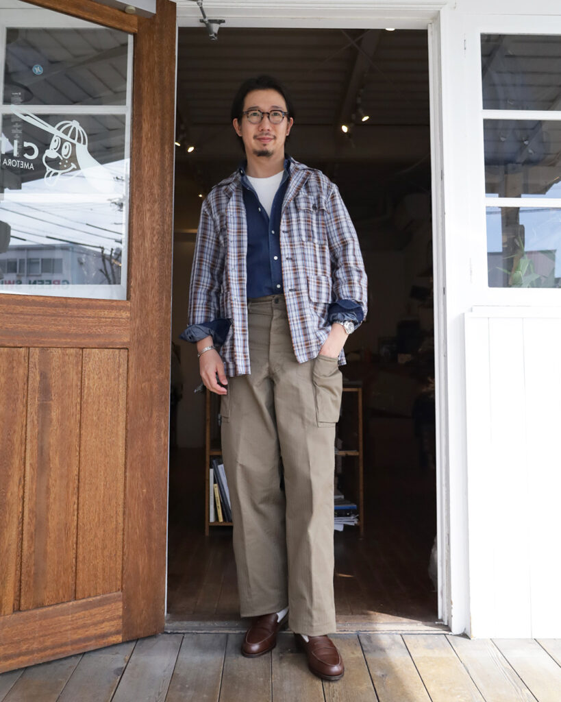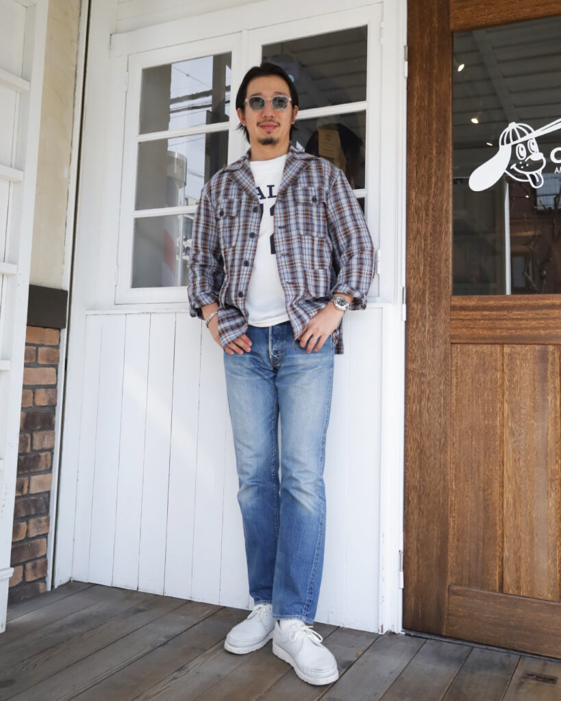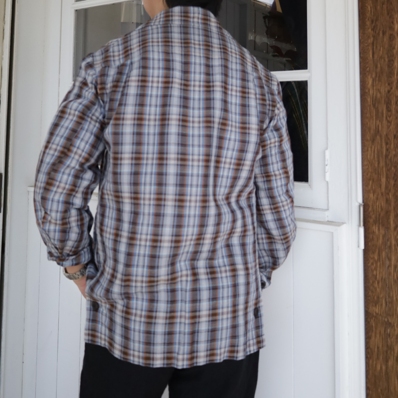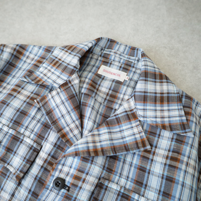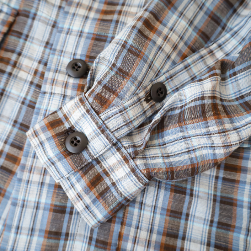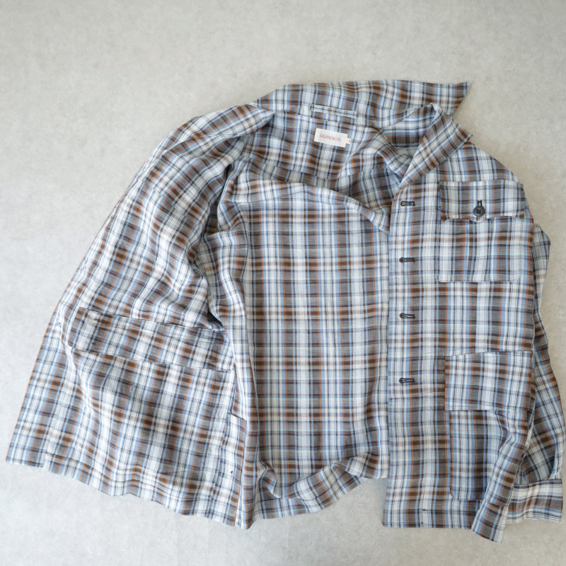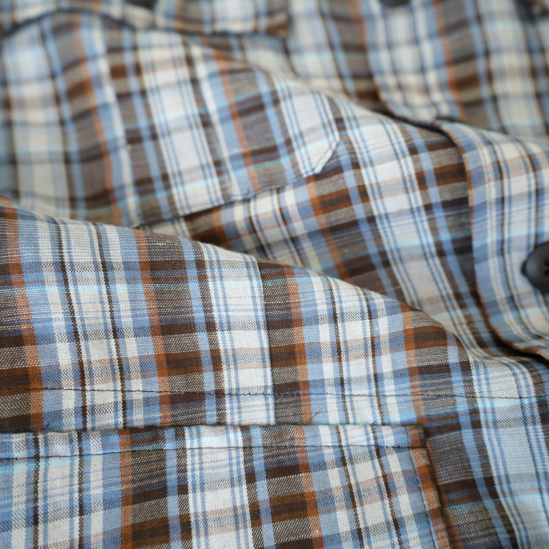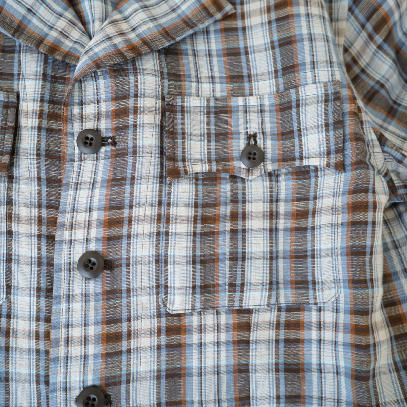 フランスはノルマンディ産のリネンを使用した鮮やかなチェック柄はシャツジャケットとしての役割を持たせたく、シワは程々になるよう、レーヨンとポリエステルを少しだけ混紡しました。