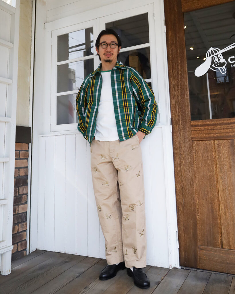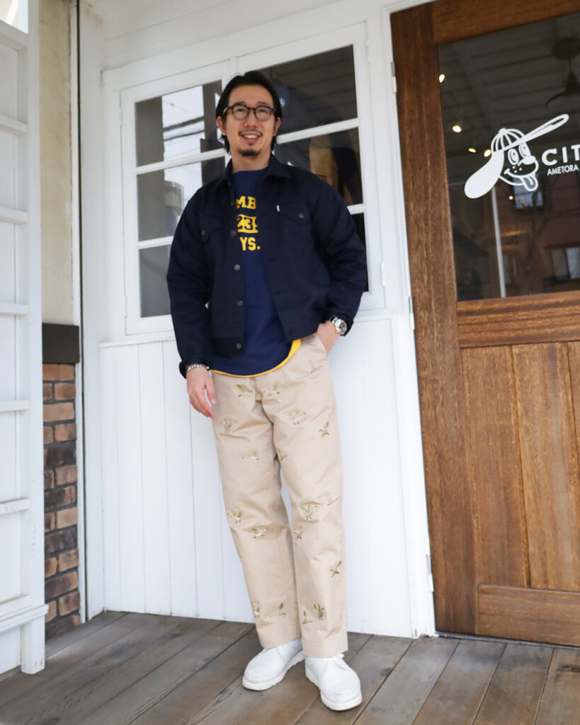定番的な着こなしですが刺繍が入るだけでどこか華やかで一捻りあるスタイルに様変わりしますね。