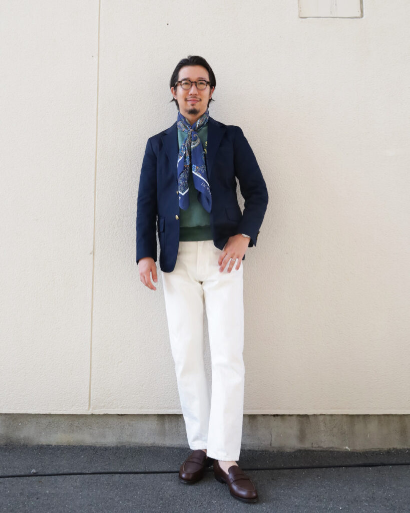 アイビーなスタイルで紺ブレにホワイトジーンズなんていかがでしょう。