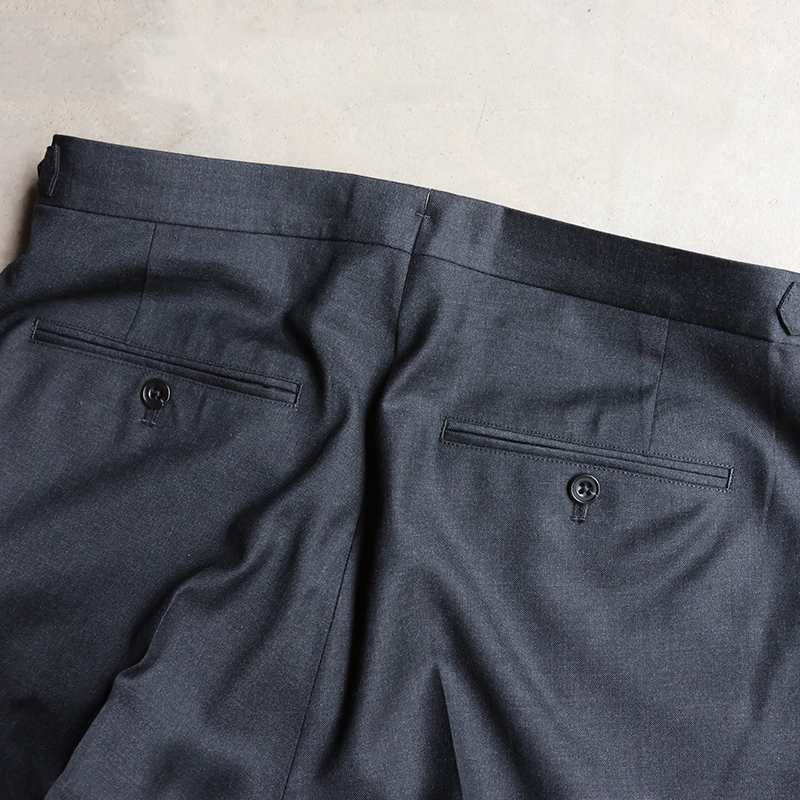 バックスタイルは両玉縁&ボタン。ウエスト背面部にはスリットも。