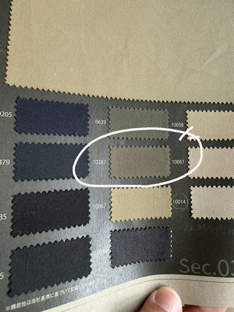 定番のオルメテックスのギャバジンを使用し、色はカーキグレーの絶妙な色。ミリタリー感強めになります。