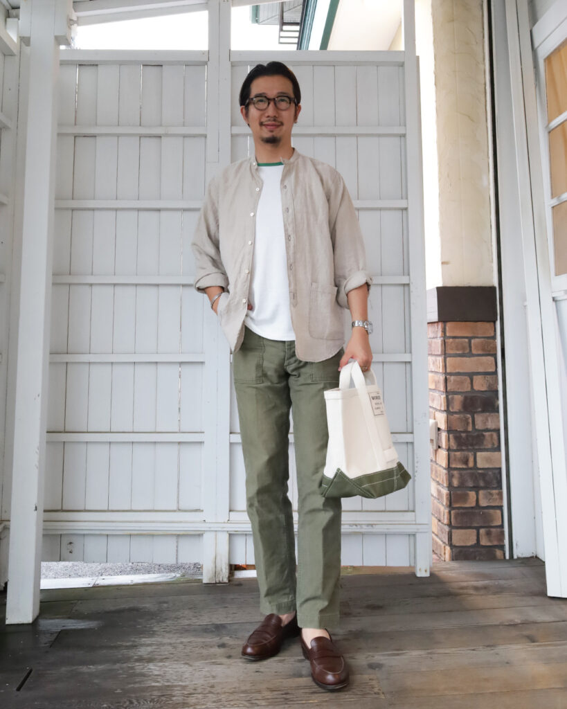 トップスはフォレスティエールシャツにリンガーTEE、足元はローファーでまとめて。