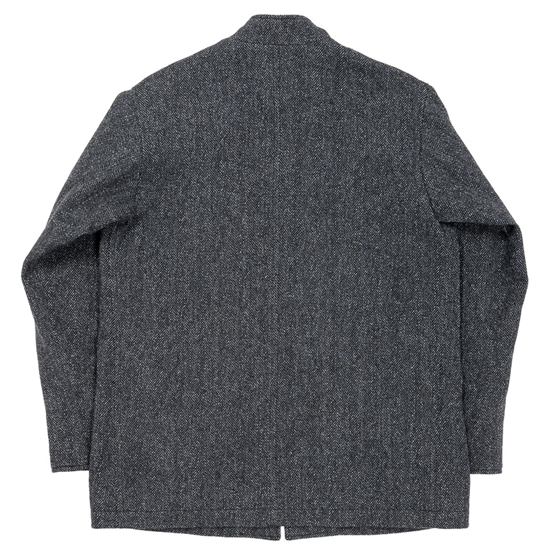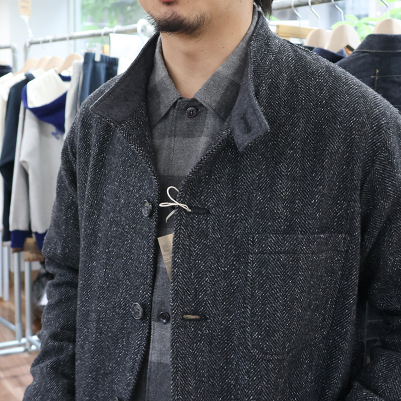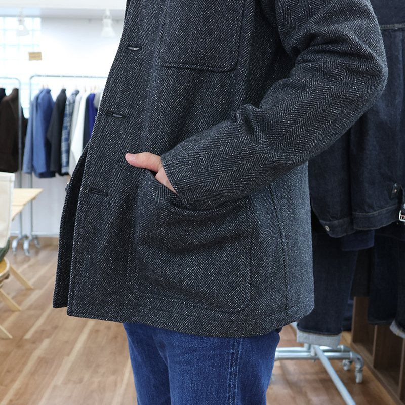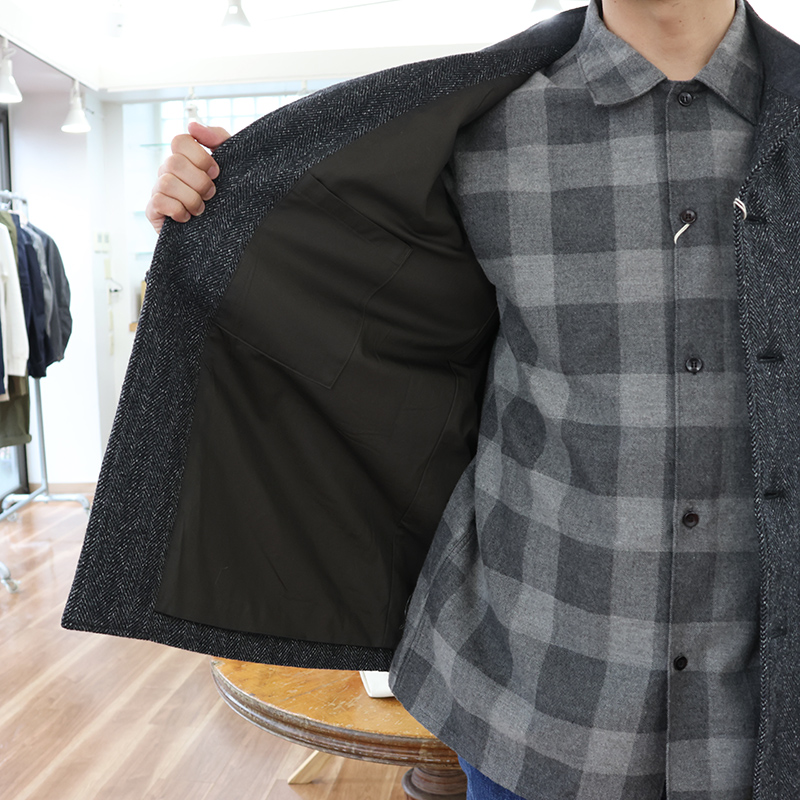 ツイストヘリンボンは Lounge Jacket にも使ったWORKERS オリジナル。経糸(タテ)ウール90/ナイロン10の黒っぽい糸に、ウール 100の白糸を巻き(ツイスト)。緯糸(ヨコ)も同じように巻き付けるのが黒✕黒。だったら1本の黒いとでもよさそうなところを、わざわざツイストした凝った生地です。ネタは、90年代の某C・バイアス期の生地から規格を持ってきました。大好きな生地で「これがバイアスじゃなかったら!」を形にしました。