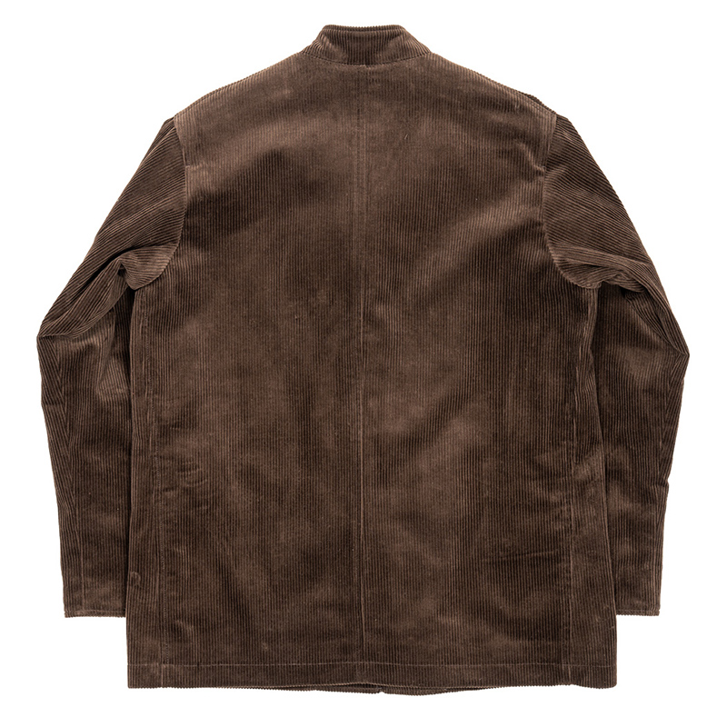 今回、ものすごく厚い・ごつい・高密度のコーデュロイ。生地屋さんが「プリスベンモスに負けないコーデュロイ!」を目指して作ってくれました。これが厚すぎて、襟が固すぎ・厚すぎて縫えない。そこでオリジナルをよく見ると、襟肌側がレザーなど別素材で切り替えている。「これだ!」と気づいて、WORKERS 版はコットンフランネルを襟裏に。これなら、もう一つの素材、表地ウールでもが絶対にチクチクしない!見た目も、よりオリジナルの雰囲気を再現できたと思います。