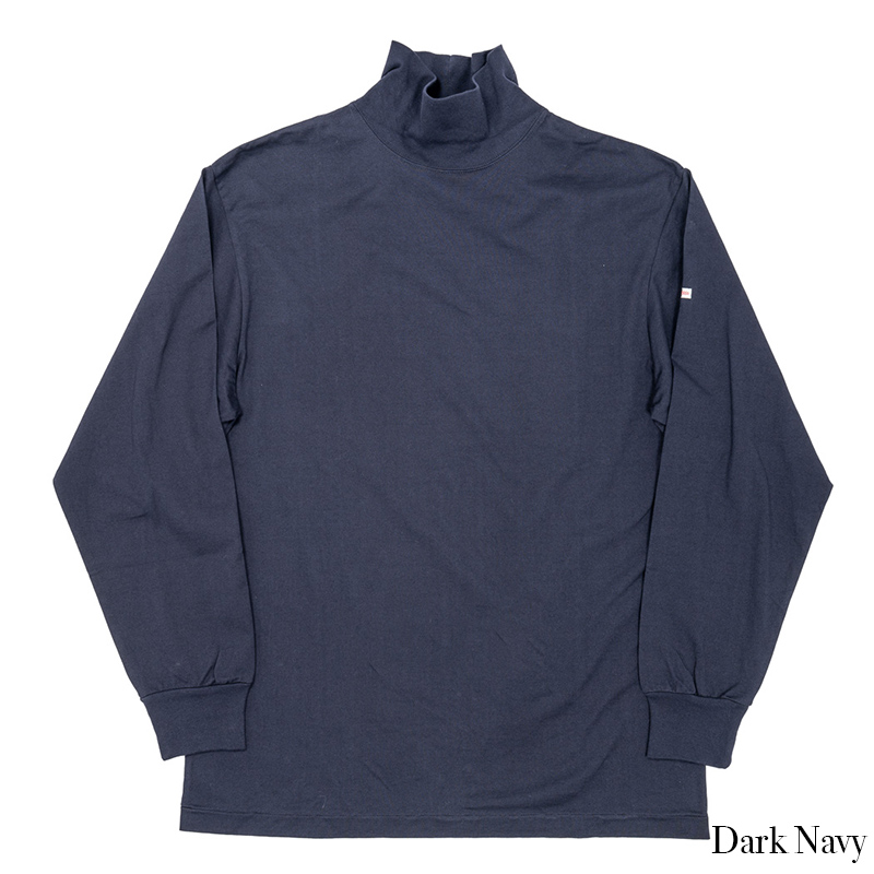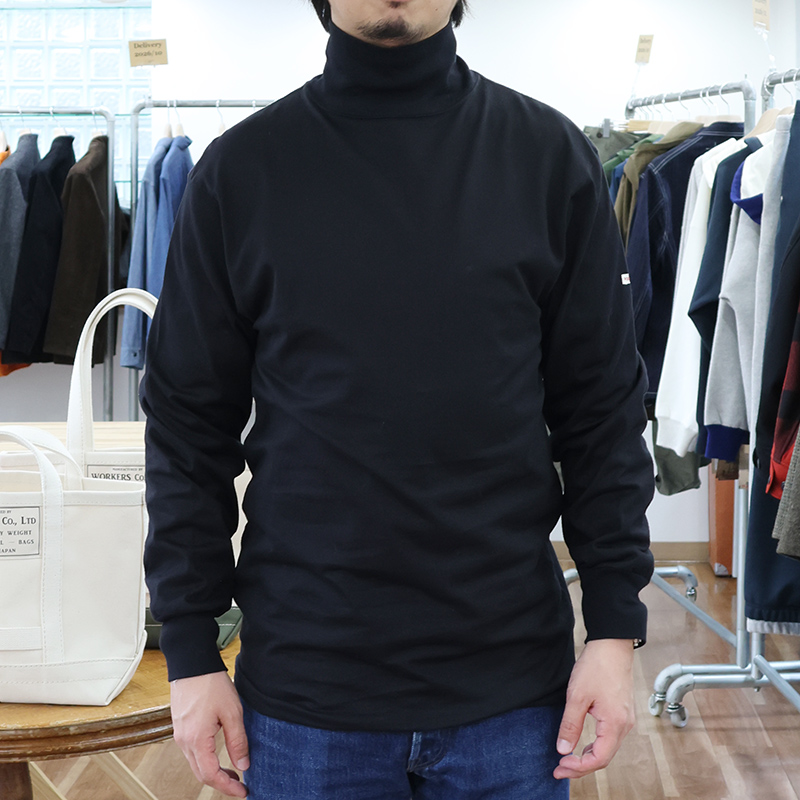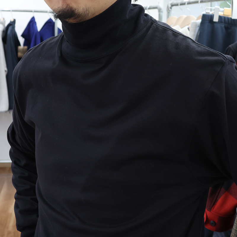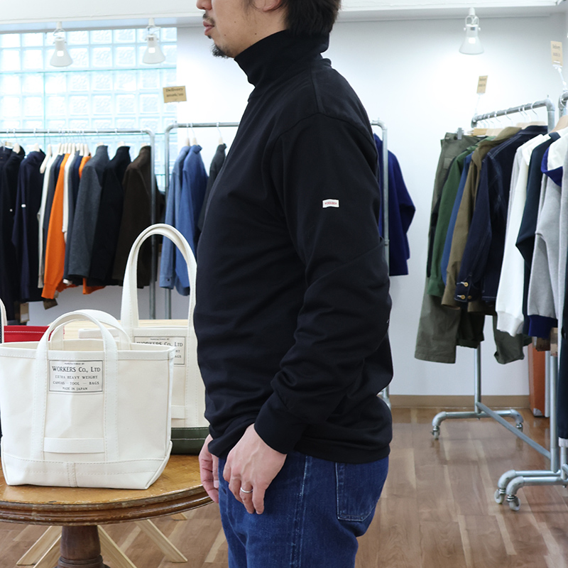 WORKERS ではタートルといえば首に沿わせてなんぼ!と思っていたので、オフタートルは初めて着ました。着てみると、楽。ちょっとクシャっとするのも「ニュアンス感がある」というのですか?なんか、女子のファッション誌みたいな事言ってますが。ニットのインナー使いだけでなく、Gジャンやシャツのインナーにも使えます。丈を少し長にしたので、タックインして万歳。ウェスト部分に生地を少し楽せる感じにすると、私の太った腹も隠れてよい感じ。