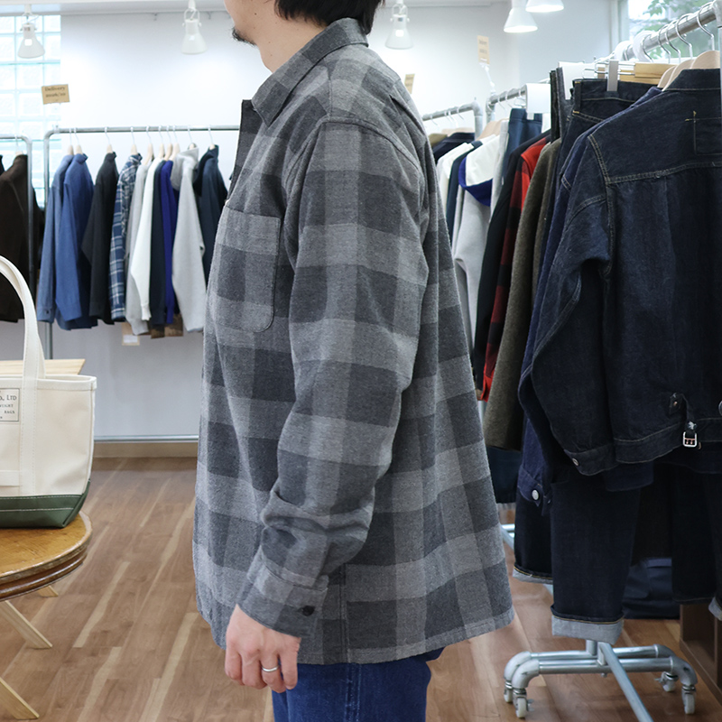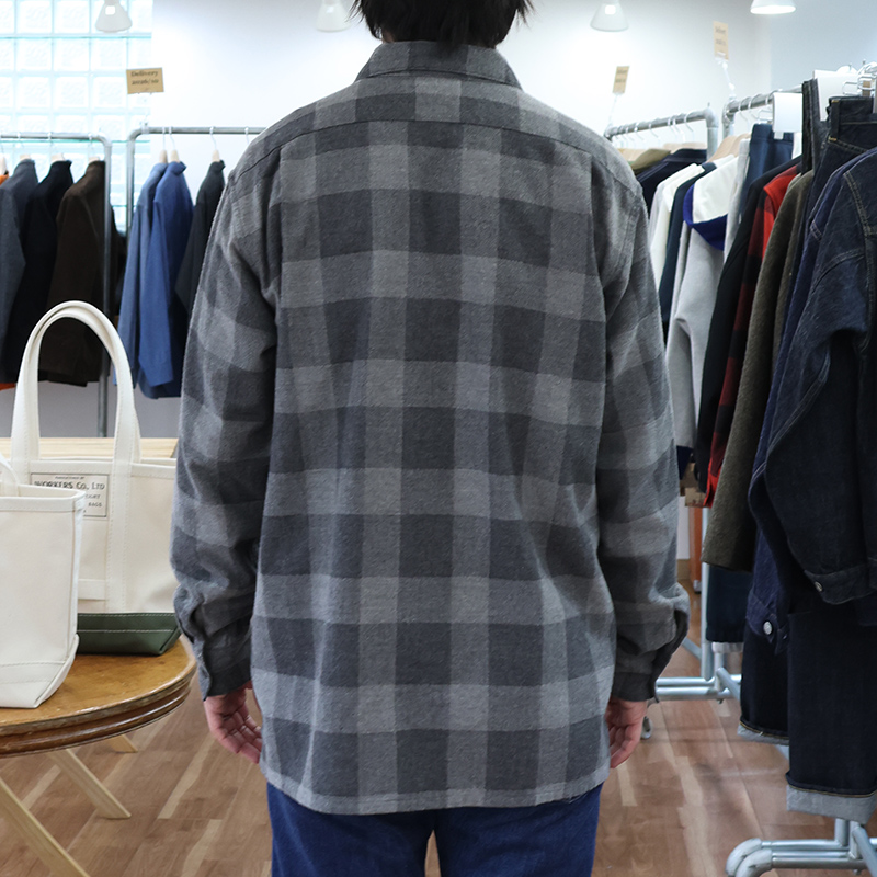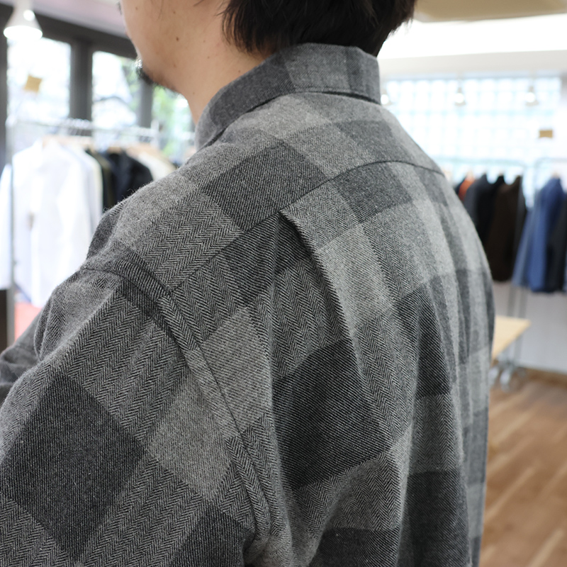 素材、コットン 90/ウール10、フランネル。生地値が高いので使うか迷いましたが、ウールが少し入ることで独特の「ふわっと感」が出る。でも、ウールはわずかなのでチクチク感はほぼ無い。それでも怖い!という方は、ぜひ、p13/2 PLY Of Turtle と合わせてください。首が直接シャツの機に触れないので絶対にチクチクしません。インディゴシャンブレーも少し暗い調のブルー。ワークシャツのフルーと比べるとわかります。スモーキーシャンブレー、一見ウールのようですが綿100。