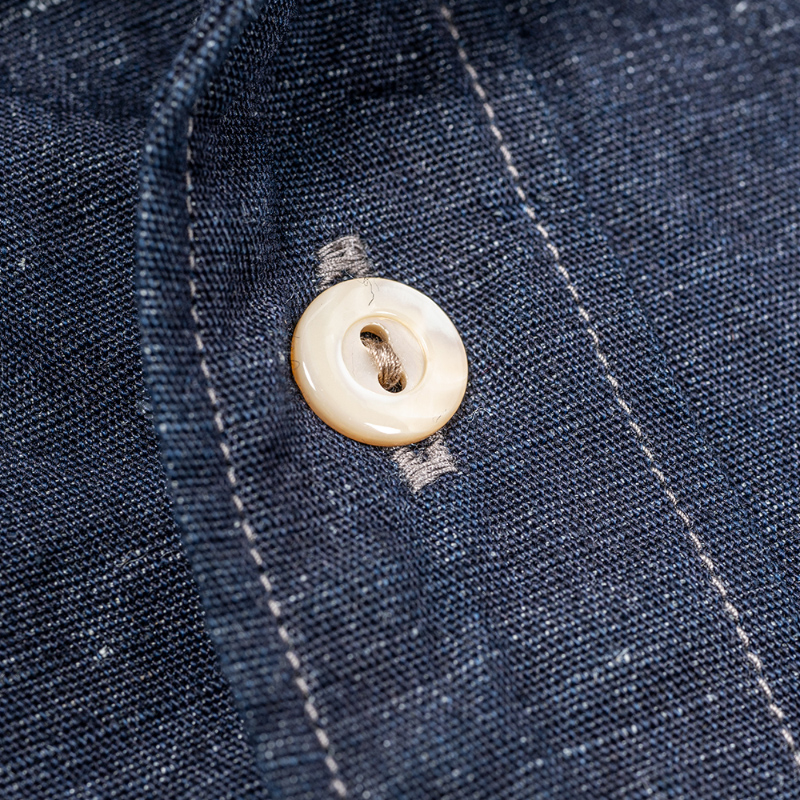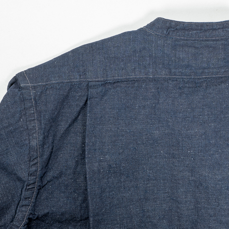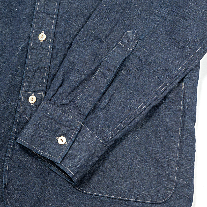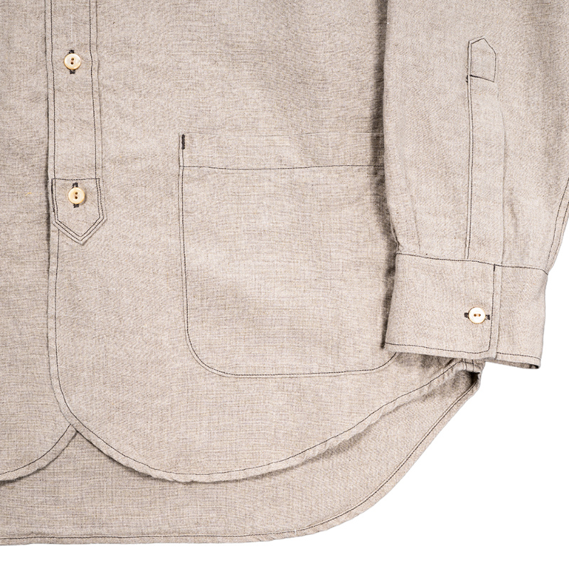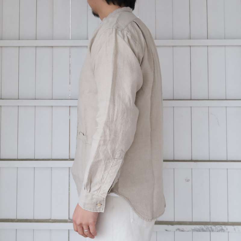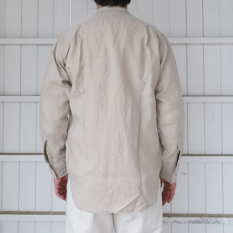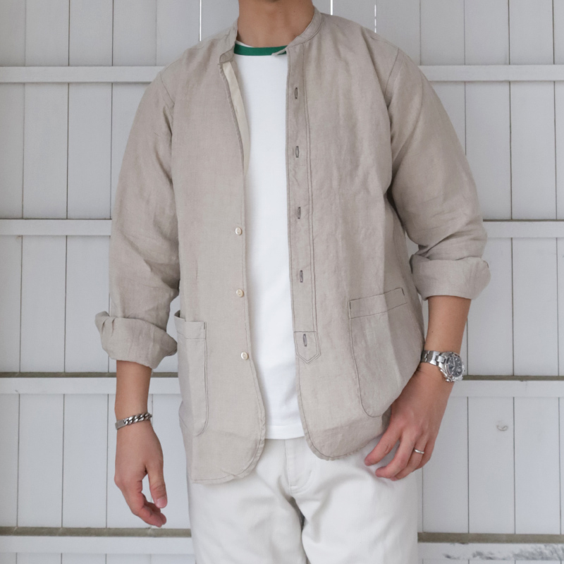フォレスティエールと言えば、スタンドカラー + 飛び出したチンストラップ。ただ、ジャケットと同じ太さだとバランス が悪いのでバンドカラーの幅に修正。もう一つ、シャツは胸ポケ 1 個の所、少し大きくしたポケットを腰の左右に配置。 これで、シャツからもう少しジャケット寄りに。逆にシャツらしさを残したのが、裾と袖口。裾を直角に、もっとジャケッ ト風にすることも考えましたが、今回はぐる~っと一筆に三巻縫いしたラウンド形状。ラウンド形状はクラシックな雰囲 気が出る。袖口は通常の開き + カフス。袖まくりがしやすいので。地味にこだわったのが茶蝶貝のボタン。二つ穴、生地 のナチュラルな雰囲気にボタンも合わせたい。真っ白でも、黒でもない、ということで茶蝶で作りました。 生地、コットンリネン。タテが綿、ヨコがトップ(ワタ状態で染めた)リネン糸。ネップがあり、ちらちらと染まり切っ ていない白い繊維があちこちに見える。この風合いがあまりにビンテージリネンそっくりで使ってしまいましたが・・・ 高い。高すぎるので生地屋さんも自社リスクでは作れず WORKERS 別注。Ecru Linen は毎年定番で使っている、生成りの 5.5 オンスリネン。去年、値上げで一度使うのをやめましたが、独特のプルプル感、肌から離れて涼しい。洗っていくと育つ、 ・Black Chambray チクチクしない。風合いに負けてまた使ってしまいました。Ecru Shirt Cloth と Black Chambray はコットン 100。リネ ¥15,000(本体価格) ンよりは多少買いやすい値段。「どうしてもリネンは肌に合わない」方にはぜひこちらをどうぞ。