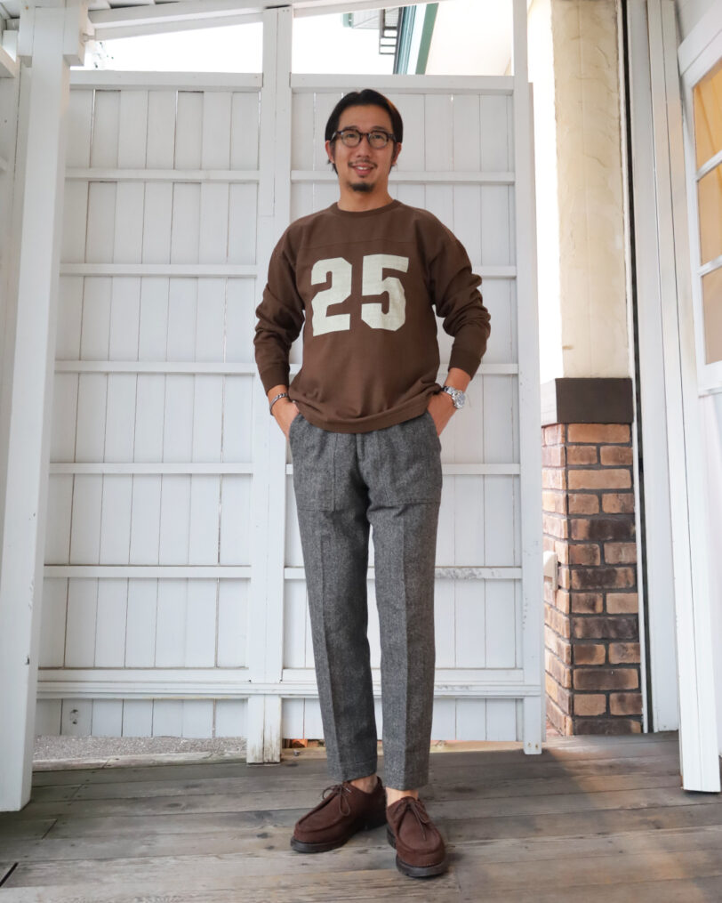 素材は10番手の糸をがっしり編み立てたヘビーウェイトのカットソー。一般的なカットソーよりも重さがあり、ややスウェットよりな生地です。
