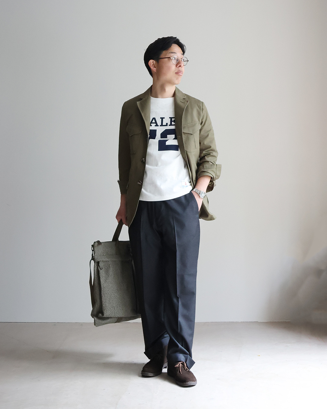 素材はイタリアCANONICO super110のウールツイルを使用。テーラード背景を駆使し奥行きのある立体感と生地のトロッとした表情が合わさり上品なワイドシルエットを構築しております。