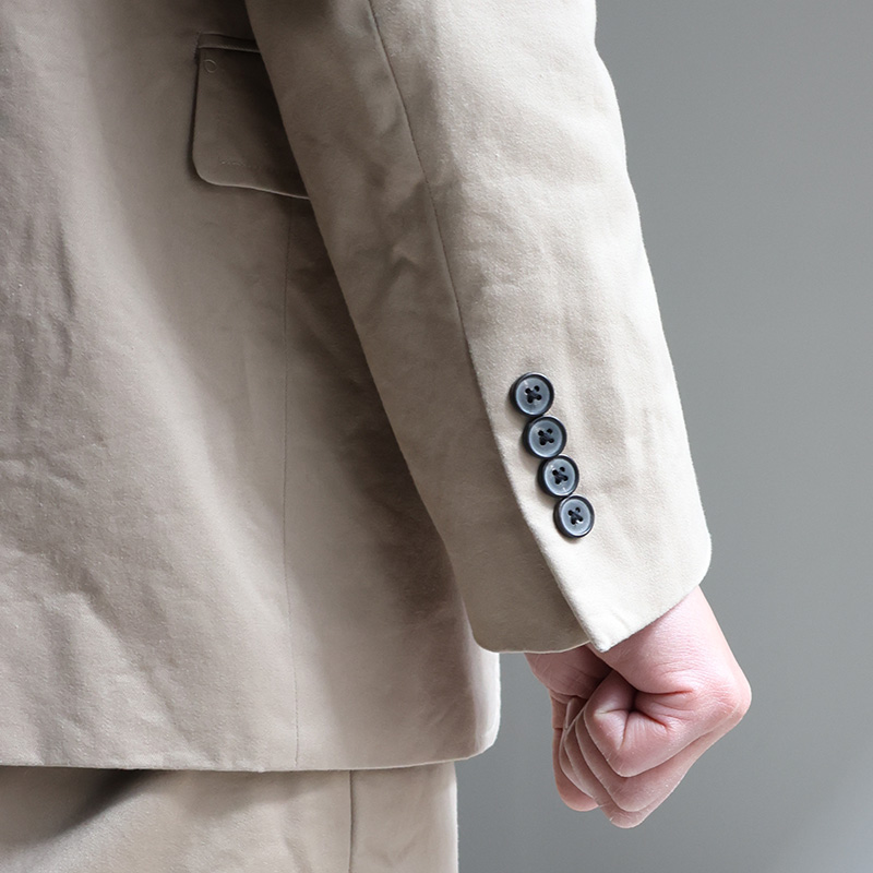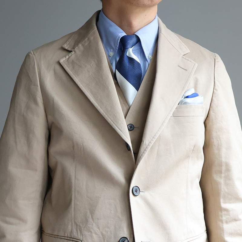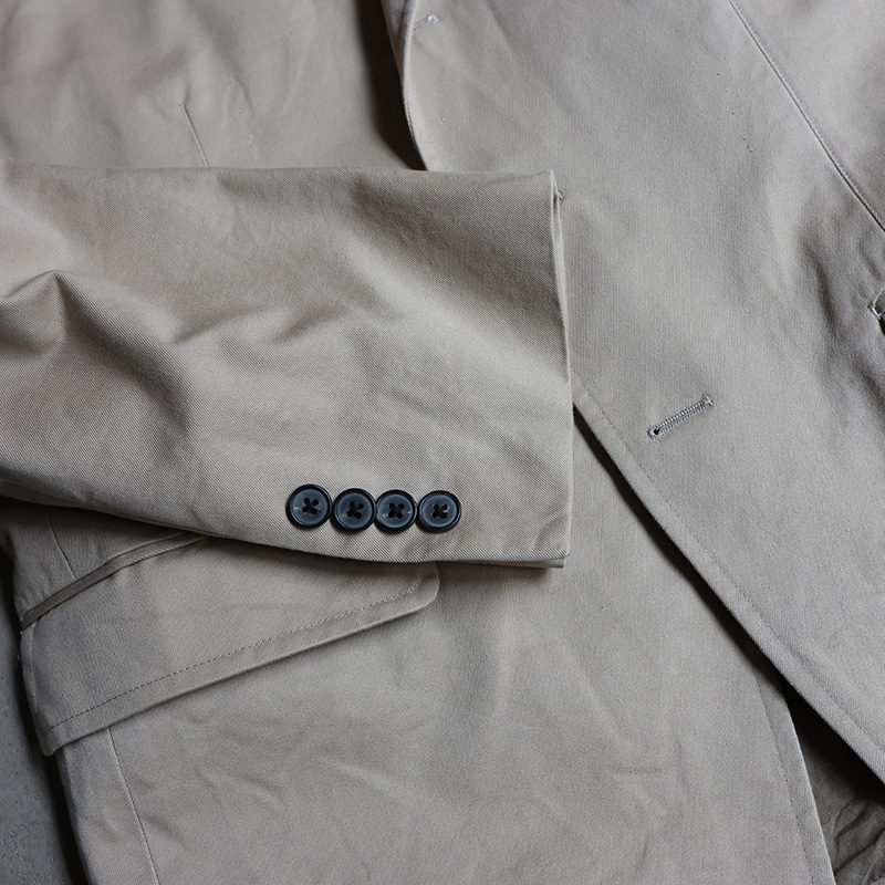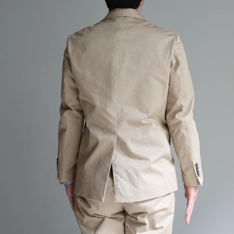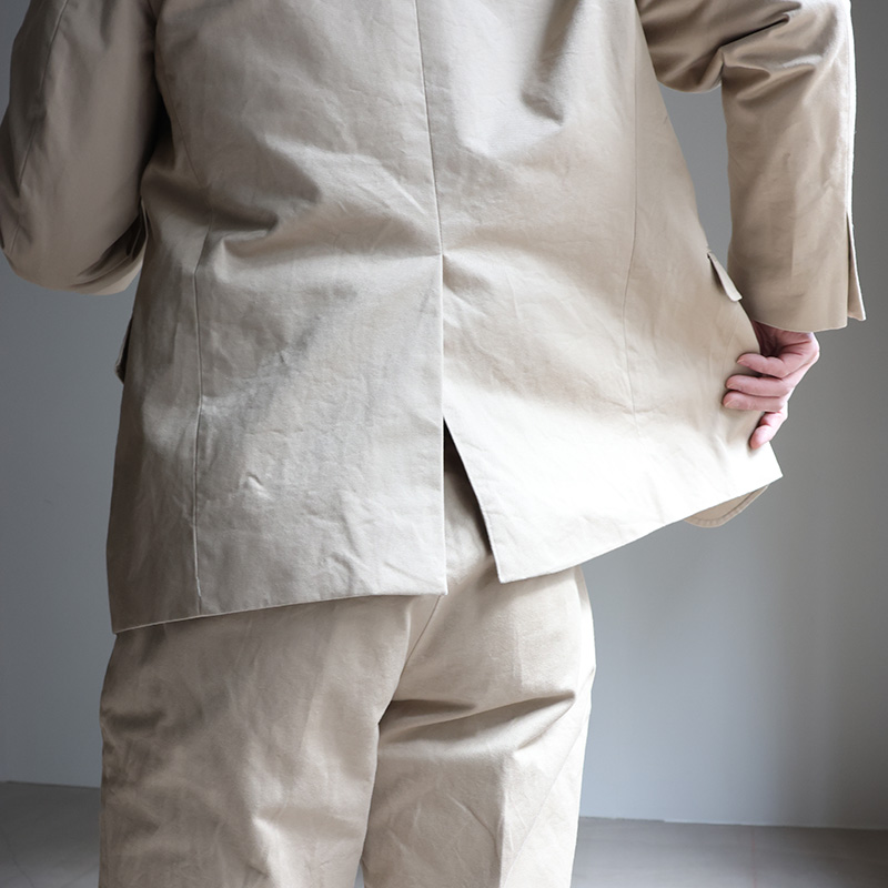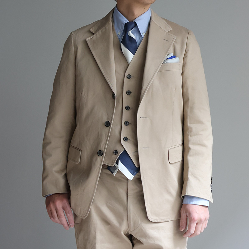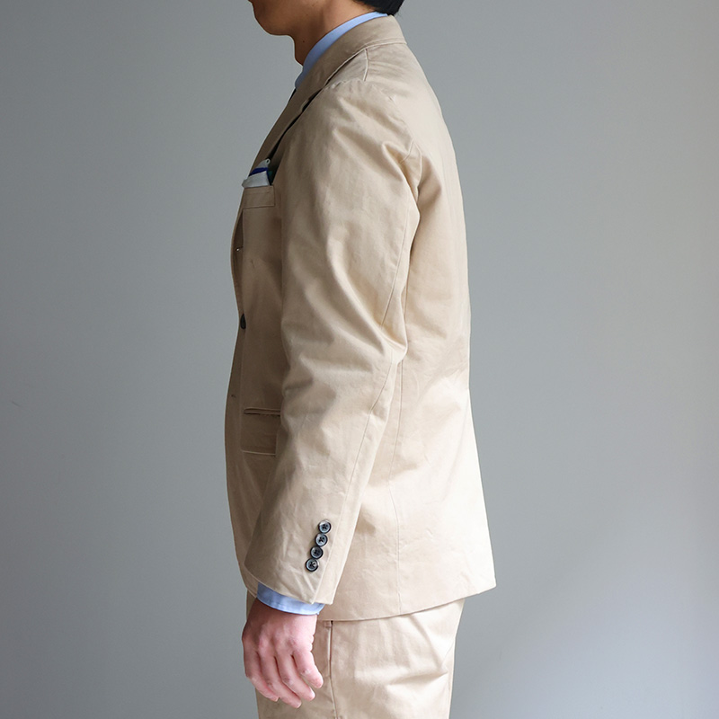 ジャケットスタイルは段返りの3つボタン一つ掛け。胸は箱ポケット、裾はフラップポケット、バックスタイルはセンターベント、ラペルにもミシンステッチにて縫製を行いアメリカンライクなテーラード仕立てに。