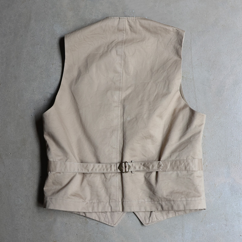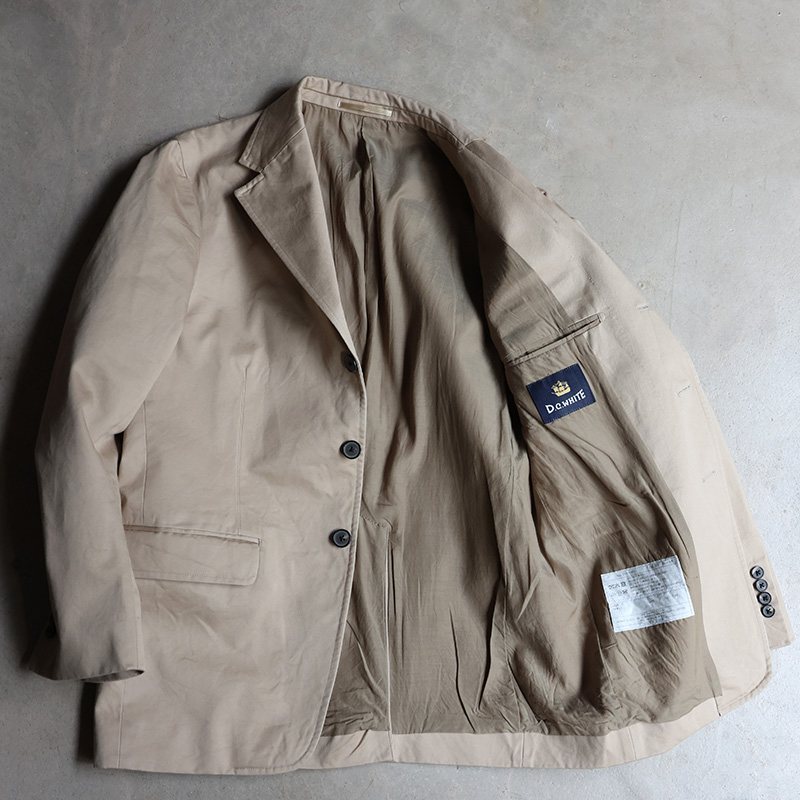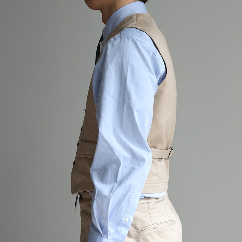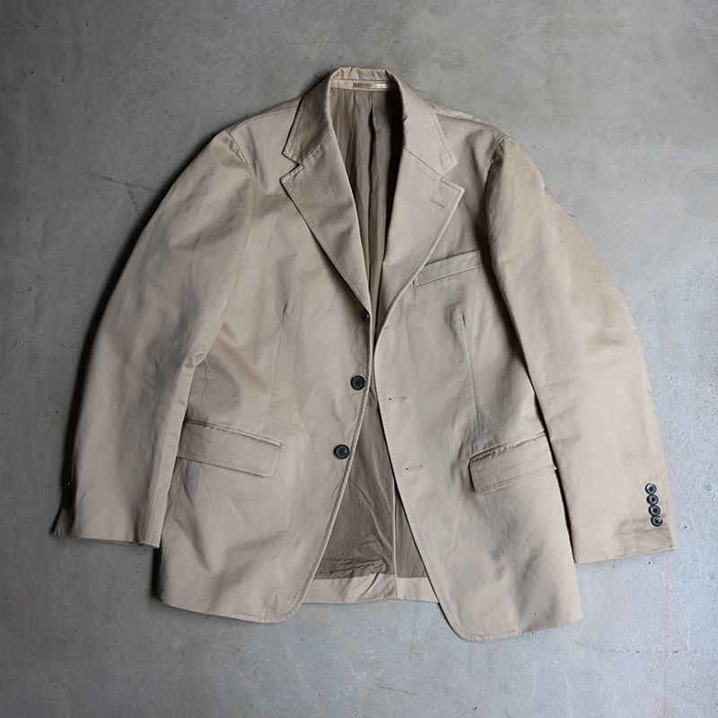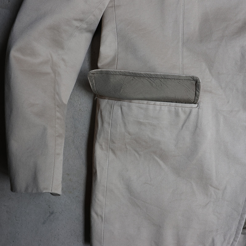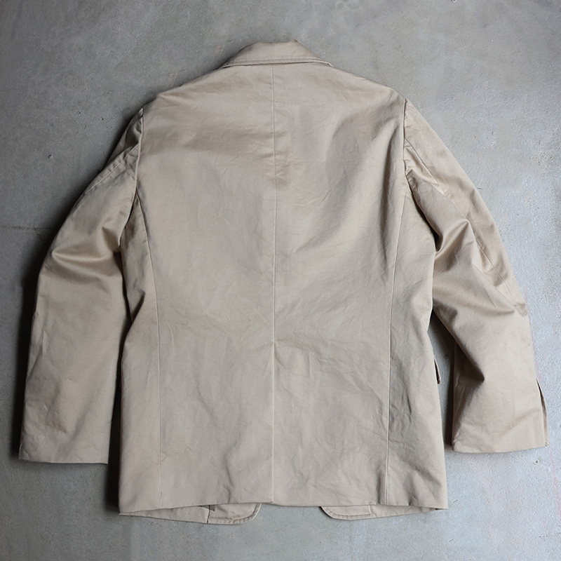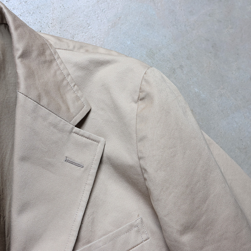 ジャケットスタイルは段返りの3つボタン一つ掛け。胸は箱ポケット、裾はフラップポケット、バックスタイルはセンターベント、ラペルにもミシンステッチにて縫製を行いアメリカンライクなテーラード仕立てに。