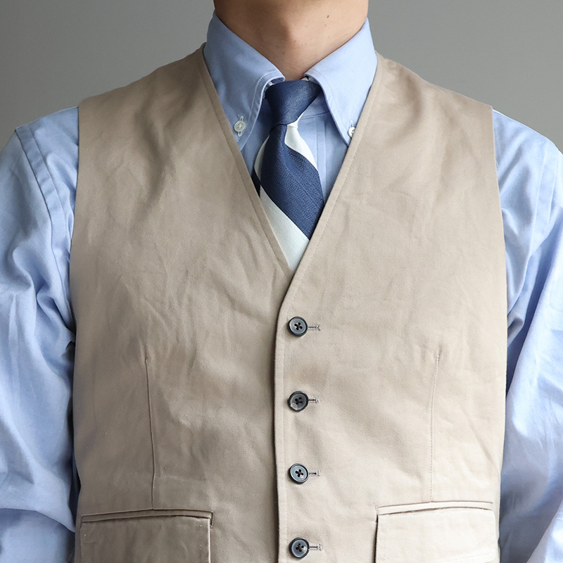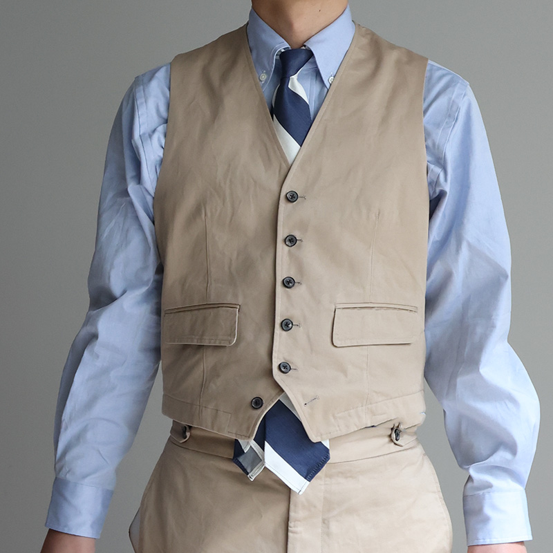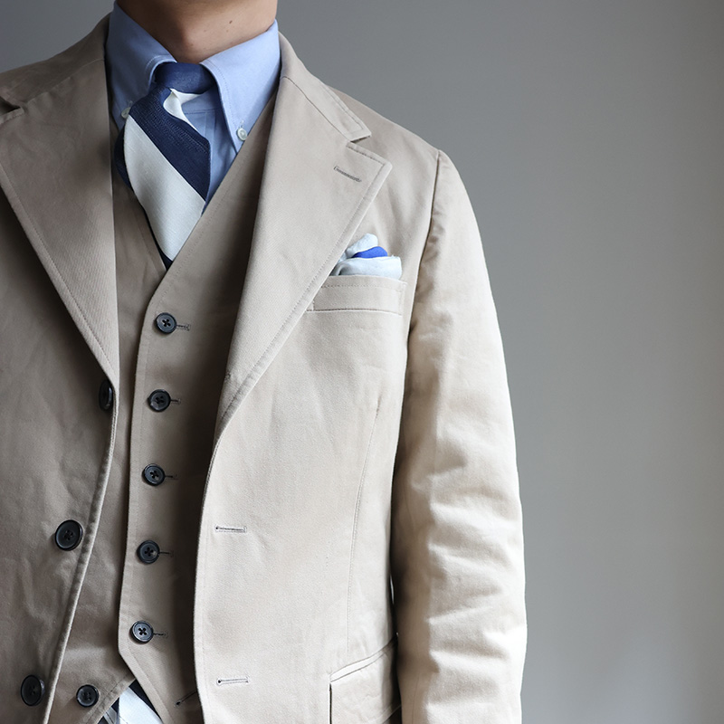 着込むほど味わいが増し、フィット感も向上していく育てるクロージングウェアとして登場したのがこちらの”The KHAKI “と名付けられたスリーピーススーツです。