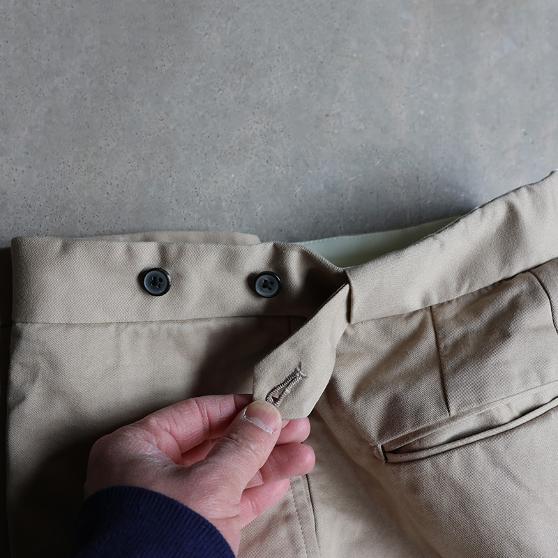トラウザーはベルトループなしのサイドアジャスター。背面部には表には見えないよう帯内部にゴムを忍ばせ従来のアジャスターよりしっかりとしたフィット感を提供してくれます。