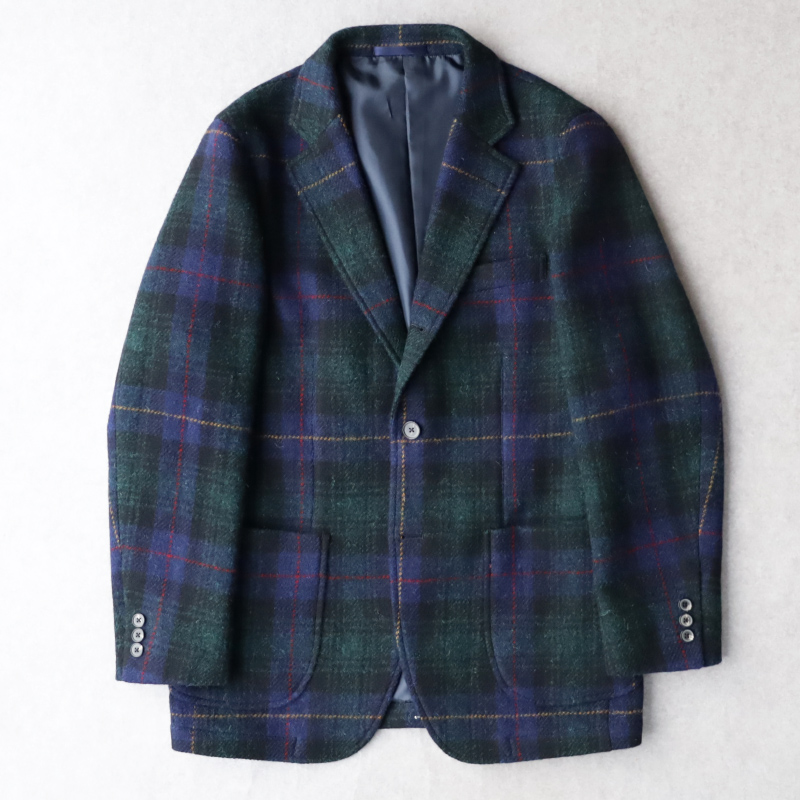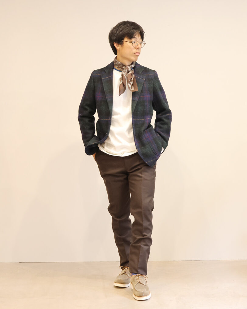 今シーズンの主役はこちらの”NEW ENGLAND”です。「シャギードッグニットを着るようにツイードジャケットを着る」を着想に構築されたジャケットであるNEW ENGLANDにはイギリス北西部のHarrisTweedを採用。ツイードの硬さではなく、色彩、軽やかさを活かす為ナチュラルフィニッシュという生地を柔らかくする加工を施しています。