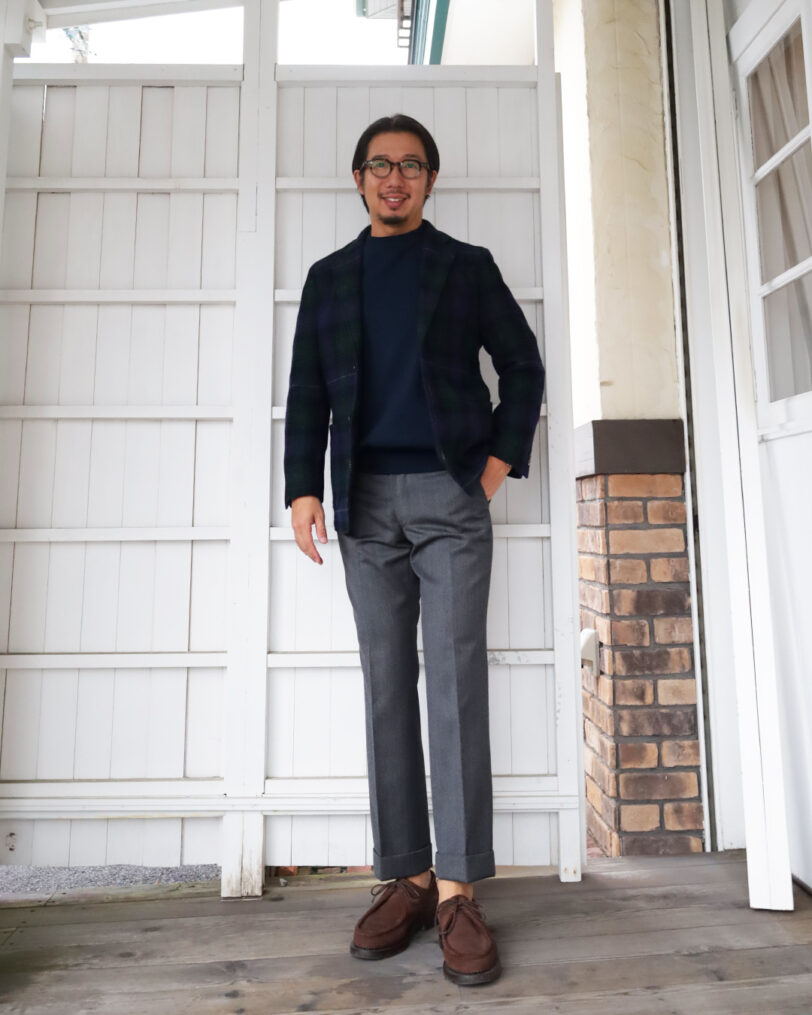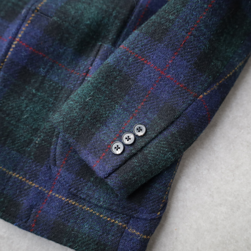 この生地にイギリスからアメリカに渡ったテーラード背景をアメリカ的解釈を踏まえ英国素材に対しナチュラルショルダーにフロントカットもアメリカントラッドを象徴するボリュームを抑えた直線的なラインに3つボタン段返りを。バックスタイルはセンターベント。