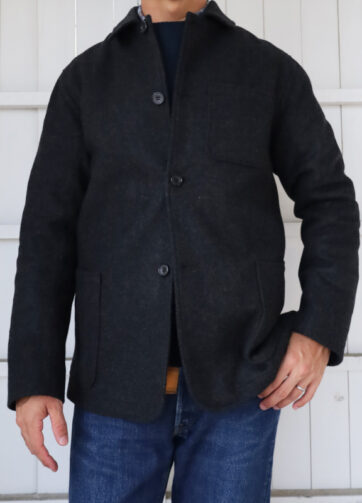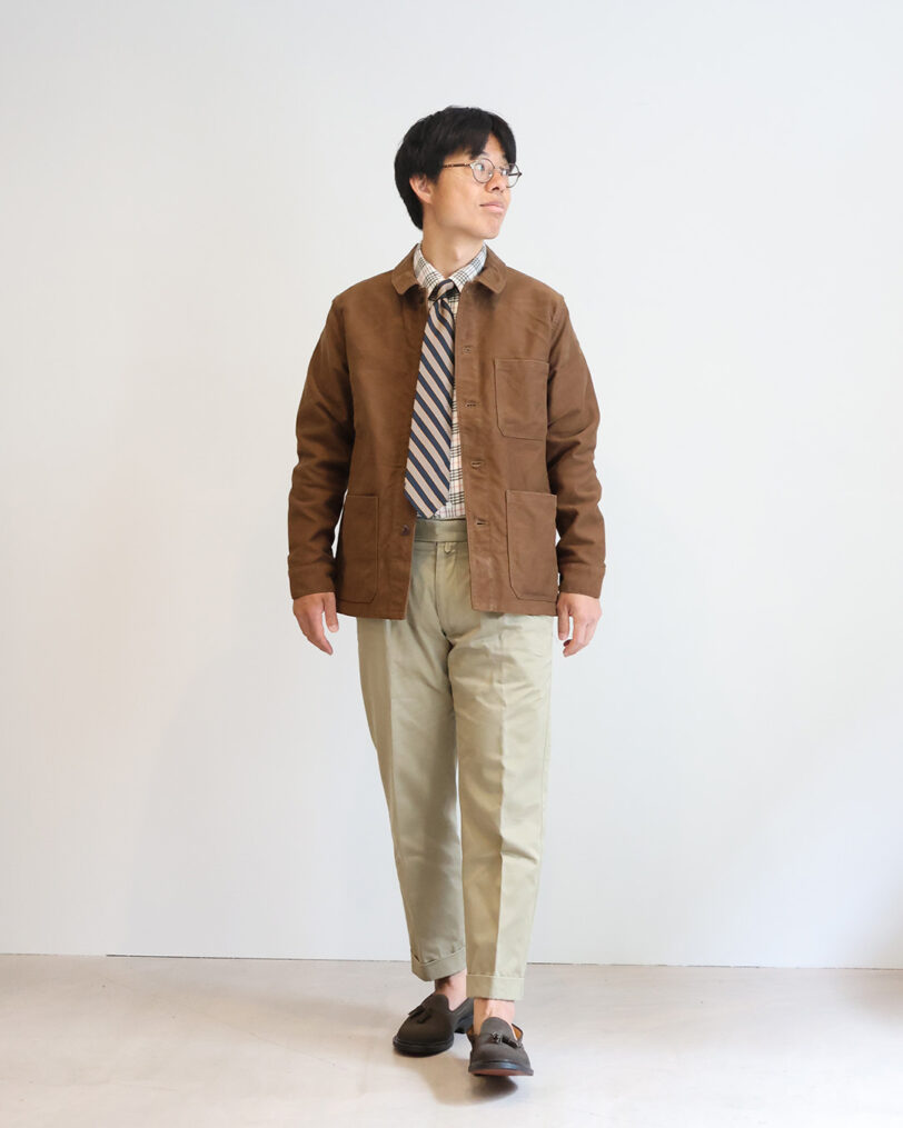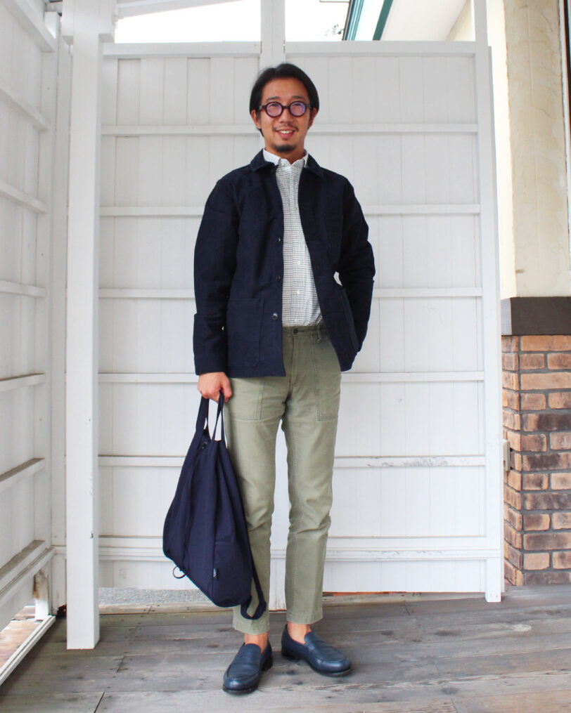 形はオーソドックスなカバーオールですが、三枚構成のパターンが特徴で前、後身頃に加え脇身頃を入れることで身体に沿った立体的なシルエットになります。また、袖付部分でも幅が広がるため腕の動作による引っかかりが少なくなります。スマートに見えながらも窮屈感のない着心地で非常に着やすいです。