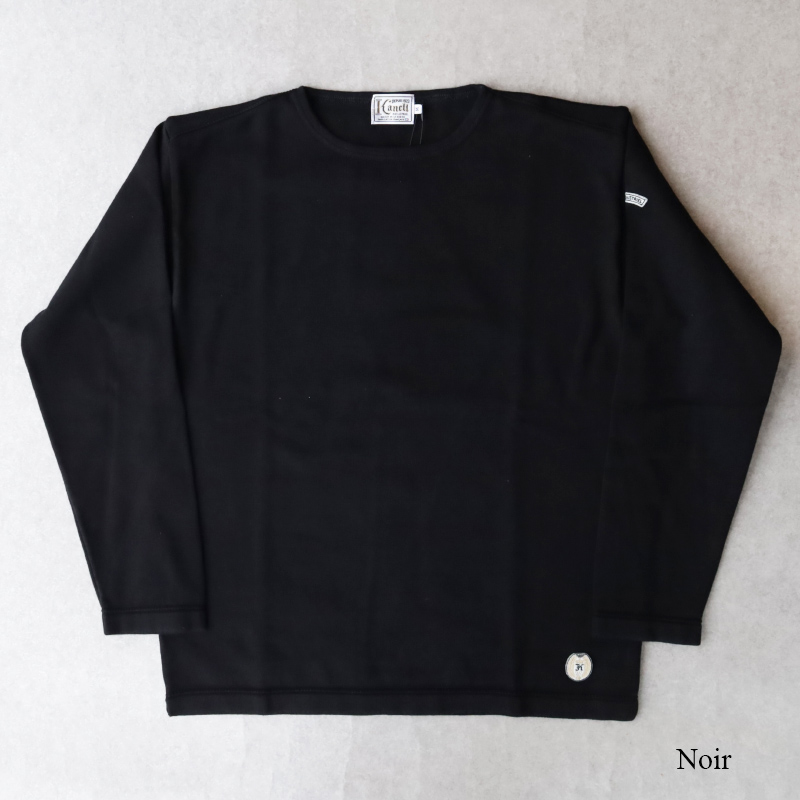 使用している素材はVintage Jersey。極限まで度目を詰めたヘビーウェイトな編地は重厚でありながら、横編み機独特の柔らかさを兼ね備えています。一般的なバスクシャツ の生地とは全く別で伸縮性があり、ガッシリとした生地ながらもはじめから着心地が柔らかく着やすいです。