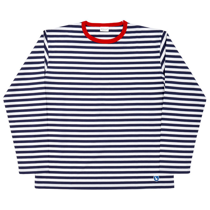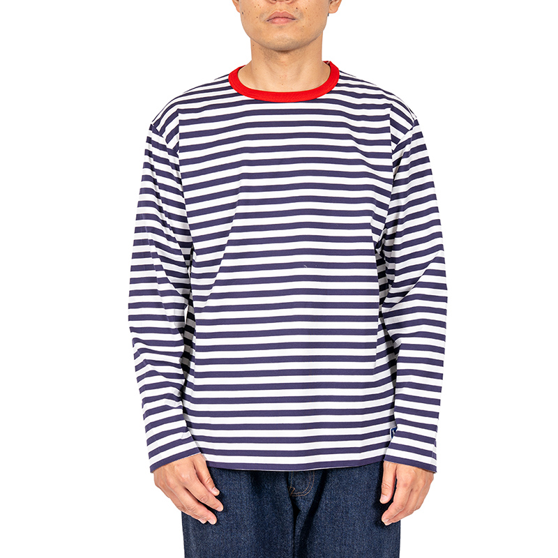 「よし市場調査だ!」と世界のUと、日本のMを見に行ってみると・・・そもそも、首をバインダー(リブで巻いた)ボーダーが無い、無い、無い。ほとんどが「つけ襟」という、首回りに自縫い+ステッチばかり。つけ襟のほうが、簡単に「頭は伸びる、首にそわせる」がしやすいのです。バインダーは、生地の伸び・縮みぐあいを考えて、首周りのパターンを引いてはサンプル、ひいてはサンプル・・・・