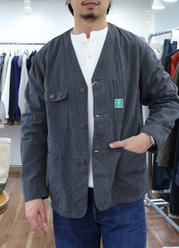 冬らしいアレンジでコーデュロイが 2 色。そして WORKERS といえばシャンブレー。洗いこんで色合いが変わるのが楽しい生地。 右ページは仕様の参考にしたオリジナル。この個体はサイズが大きすぎるのであくまで「仕様」の参考品。全体シルエットの参考はまた別な個体を使いまし た。何かを参考にするときは、できるだけ多く集めてサイズ違い・個体による仕様の差も見比べて「そのものらしさ」と「着やすさ・機能性」でベストなバ ランスを探るようにしています。(おかげで職場は異様に服があるので、老後はネットショップ始めます) 6ボタンの特徴、前立てのボタンが5個+台襟が1個で合計6個。結果、台襟から身頃の第一ボタンの間が少し広く開きます。ここから、中のTシャツがちらっ と見える感がラフで良い!とか言われています。ただ、見えるということは中の T シャツ、首ダルダルだとさすがに汚らしい。中に着る T シャツは首がしっ かり詰まりつつ、厚手過ぎない物がおすすめ。WORKERS の T シャツをお勧めしたいところですが、2PLY T はポケ T なので合わせづらい。来年は 6 ボタン インナー T でも作りましょうか。現行品だと、首回りがバインダーで薄手のものがおすすめ。これが探すと意外に無い。Soffe のパック T が「生地薄手・首 バインダー」でお勧めですが、最近、円安だからか輸入が安定しません。