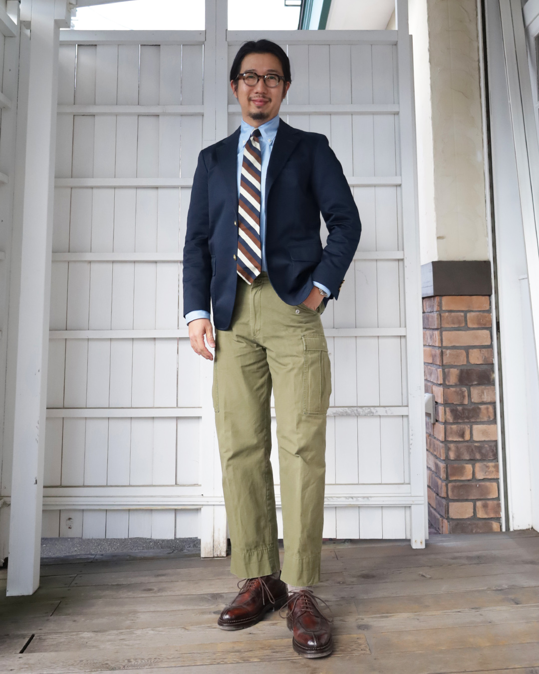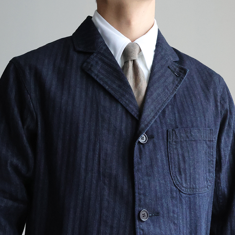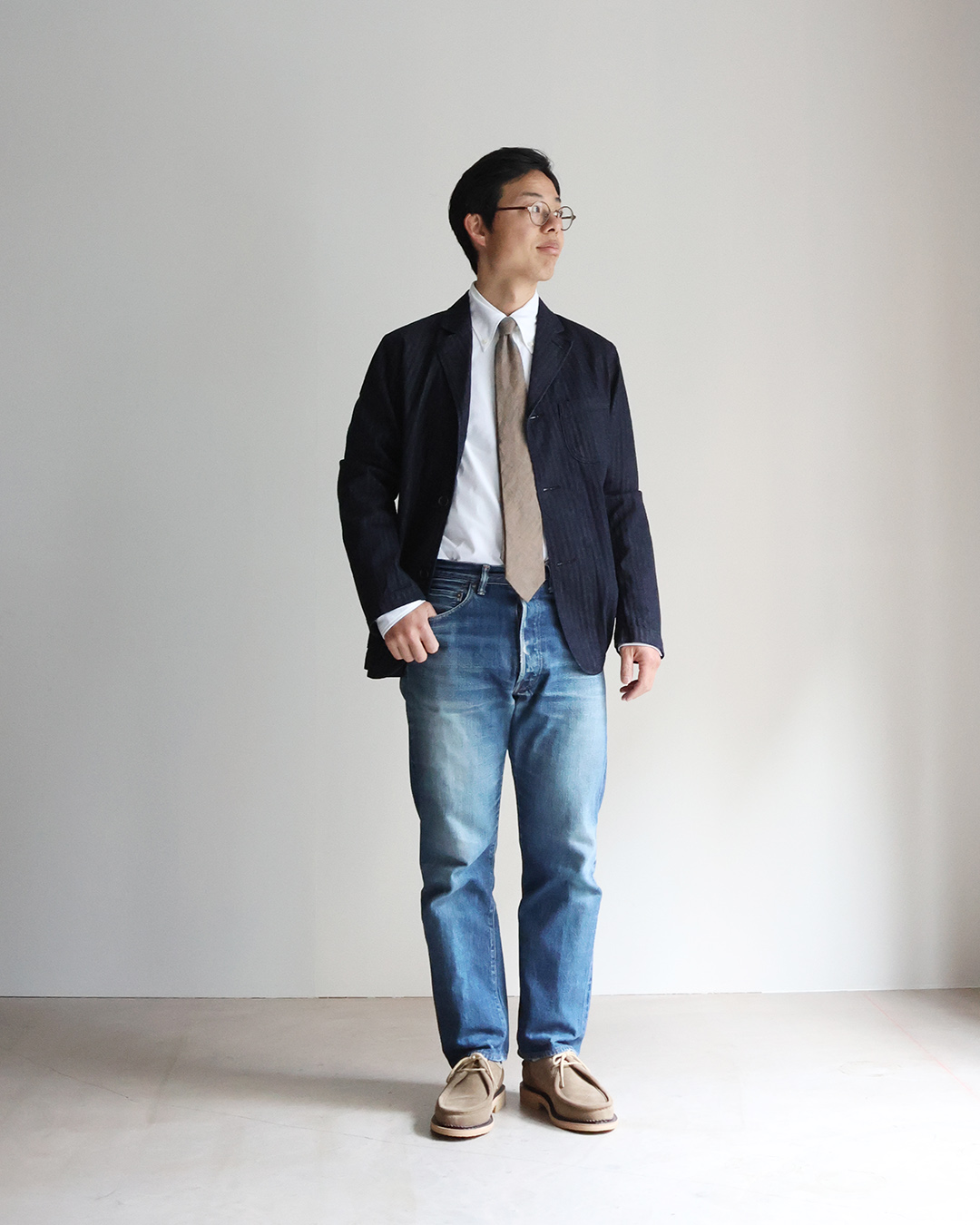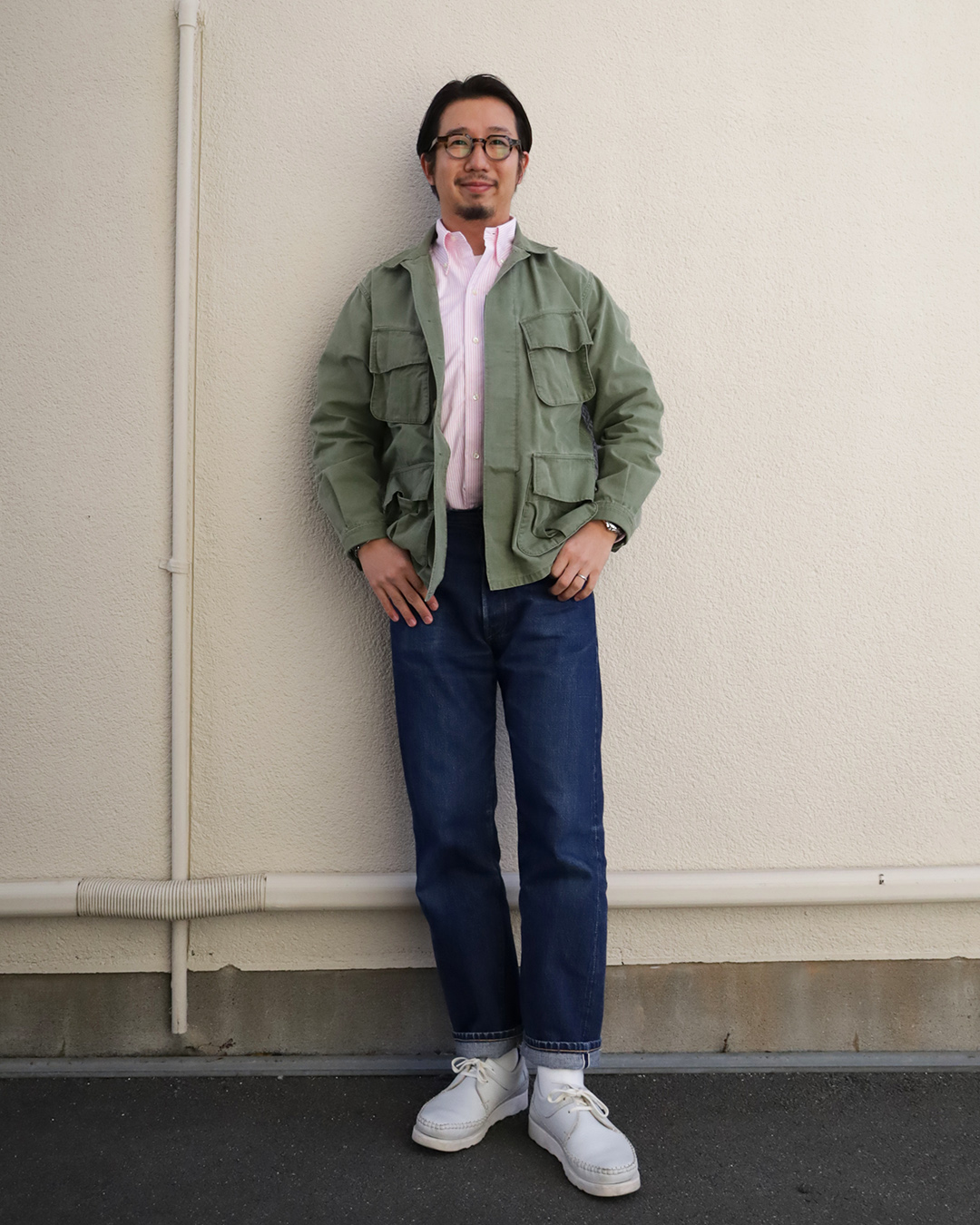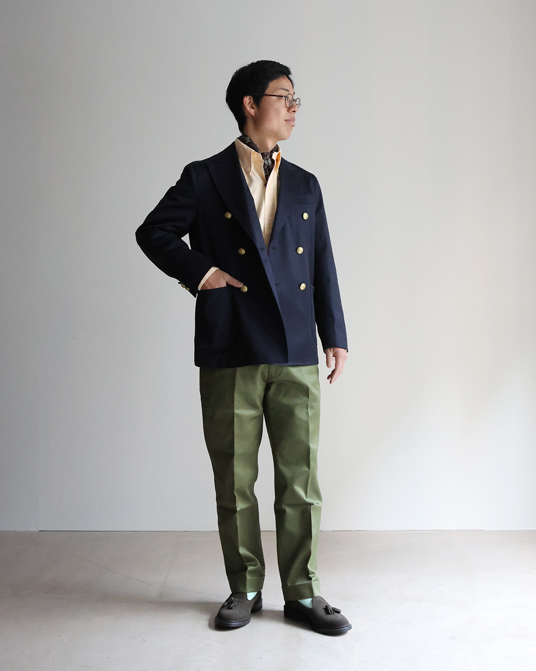 25FW・昨年の 6 ボタン BD。フロントが身頃 5 個 + 台襟 1 個のボタン配置。オリジナルに似せて袖が 太い、カフスのボタン位置が高い、着丈も長い、タックイン前提。オリジナルに忠実な、タテに長い・ 袖の太いシルエットでした。それに対し、「ボディは WORKERS 定番の Modified Fit。フロントボタン だけ 6 ボタン BD のバランスに出来ないか?」とご要望があり作ってみました。