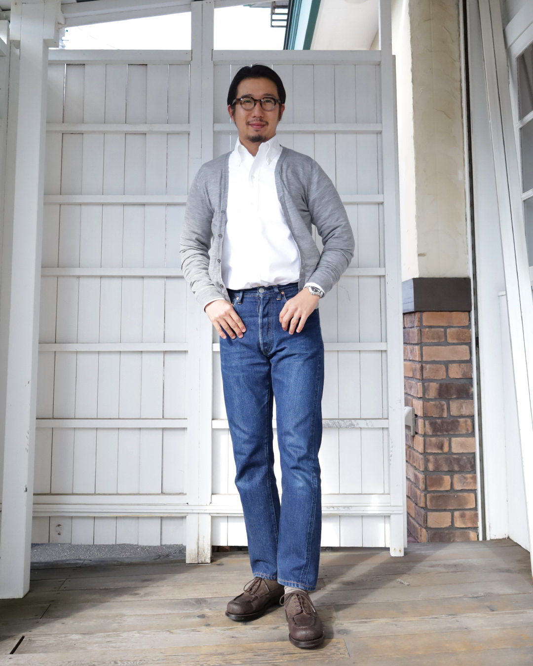 着丈 /15 サイズで 76-7 センチほど。裾を出しても入れても着られる丈。袖は太すぎず、かといって 袖まくりが出来ないほど細くもない。カフスボタン位置、ごくベーシックにカフスの真ん中。